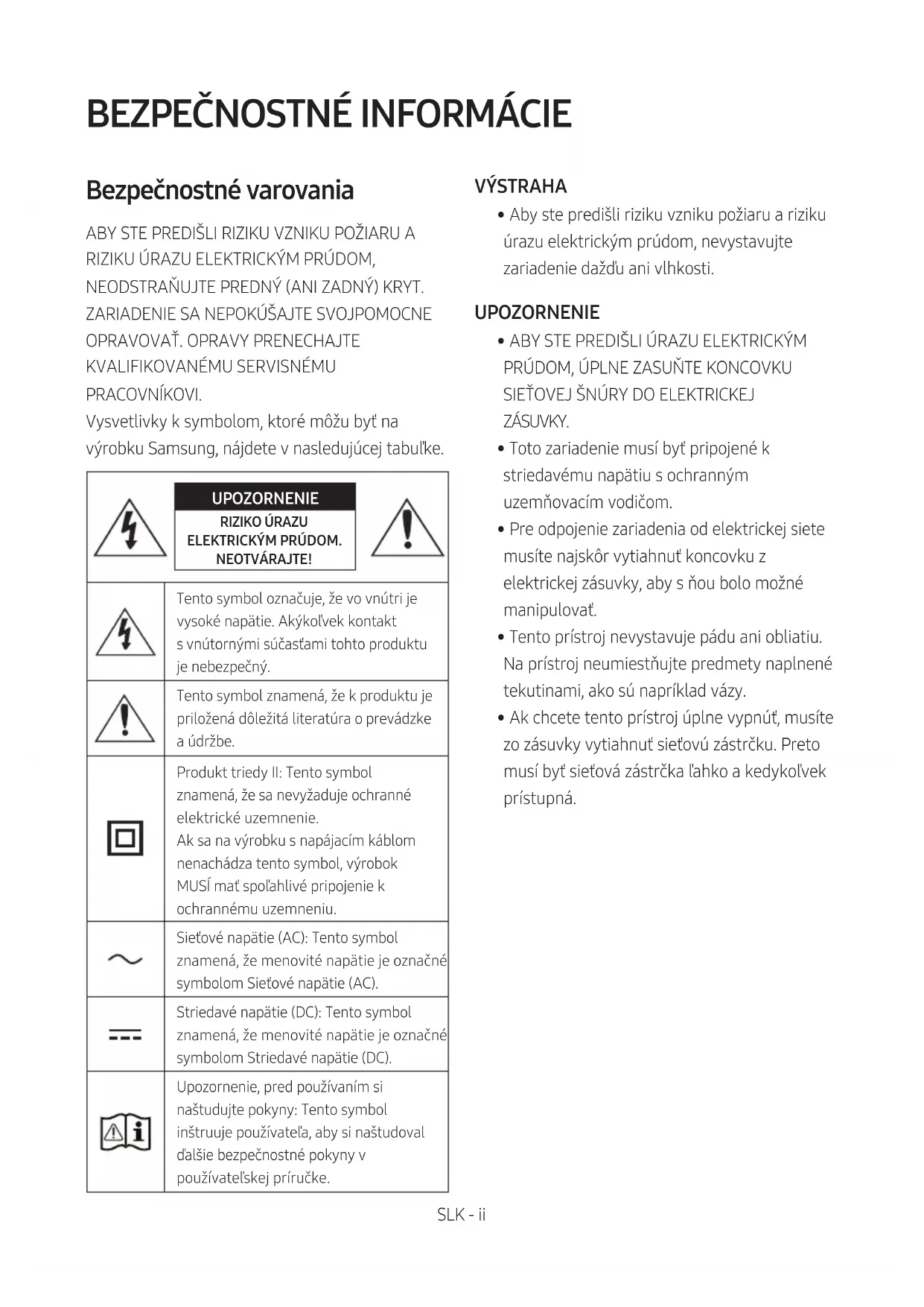 PRACOVNÍKOVI. Vysvetlivky k symbolom, ktoré môžu byť na výrobku Samsung, nájdete v nasledujúcej tabuľke. UPOZORNENIE RIZIKO ÚRAZU ELEKTRICKÝM PRÚDOM. NEOTVÁRAJTE!Tento symbol označuje, že vo vnútri je vysoké napätie. Akýkoľvek kontakt svnútornými súčasťami tohto produktu je nebezpečný.Tento symbol znamená, že kproduktu je priložená dôležitá literatúra oprevádzke a údržbe.Produkt triedy II: Tento symbol znamená, že sa nevyžaduje ochranné elektrické uzemnenie.Ak sa na výrobku s napájacím káblom nenachádza tento symbol, výrobok MUSÍ mať spoľahlivé pripojenie k ochrannému uzemneniu. Sieťové napätie (AC): Tento symbol znamená, že menovité napätie je označné symbolom Sieťové napätie (AC).Striedavé napätie (DC): Tento symbol znamená, že menovité napätie je označné symbolom Striedavé napätie (DC).Upozornenie, pred používaním si naštudujte pokyny: Tento symbol inštruuje používateľa, aby si naštudoval ďalšie bezpečnostné pokyny v používateľskej príručke. VÝSTRAHA