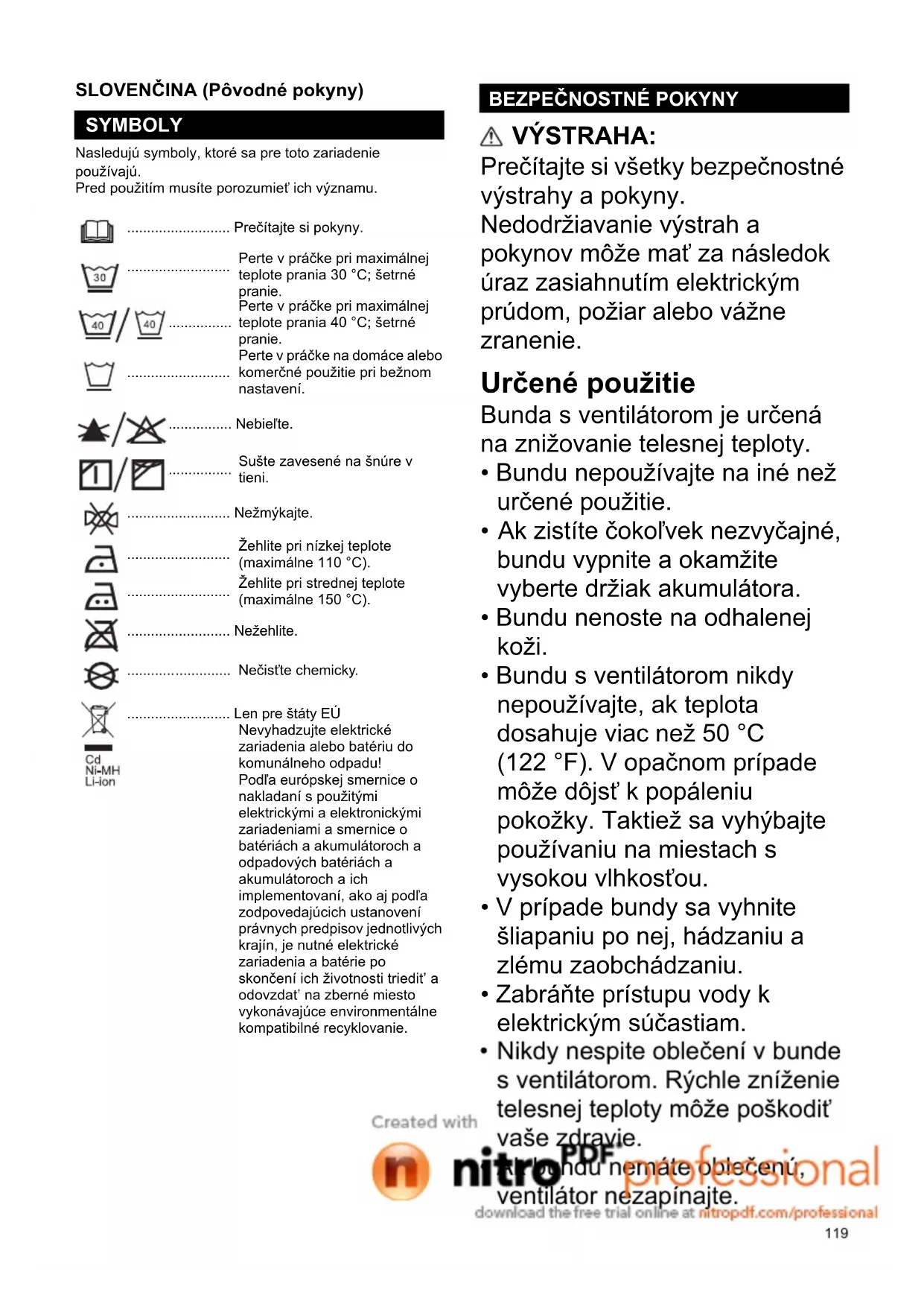 SLOVENČINA (Pôvodné pokyny) Nasledujú symboly, ktoré sa pre toto zariadenie používajú. Pred použitím musíte porozumieť ich významu. VÝSTRAHA: Prečítajte si všetky bezpečnostné výstrahy a pokyny. Nedodržiavanie výstrah a pokynov môže mať za následok úraz zasiahnutím elektrickým prúdom, požiar alebo vážne zranenie. Určené použitie Bunda s ventilátorom je určená na znižovanie telesnej teploty.