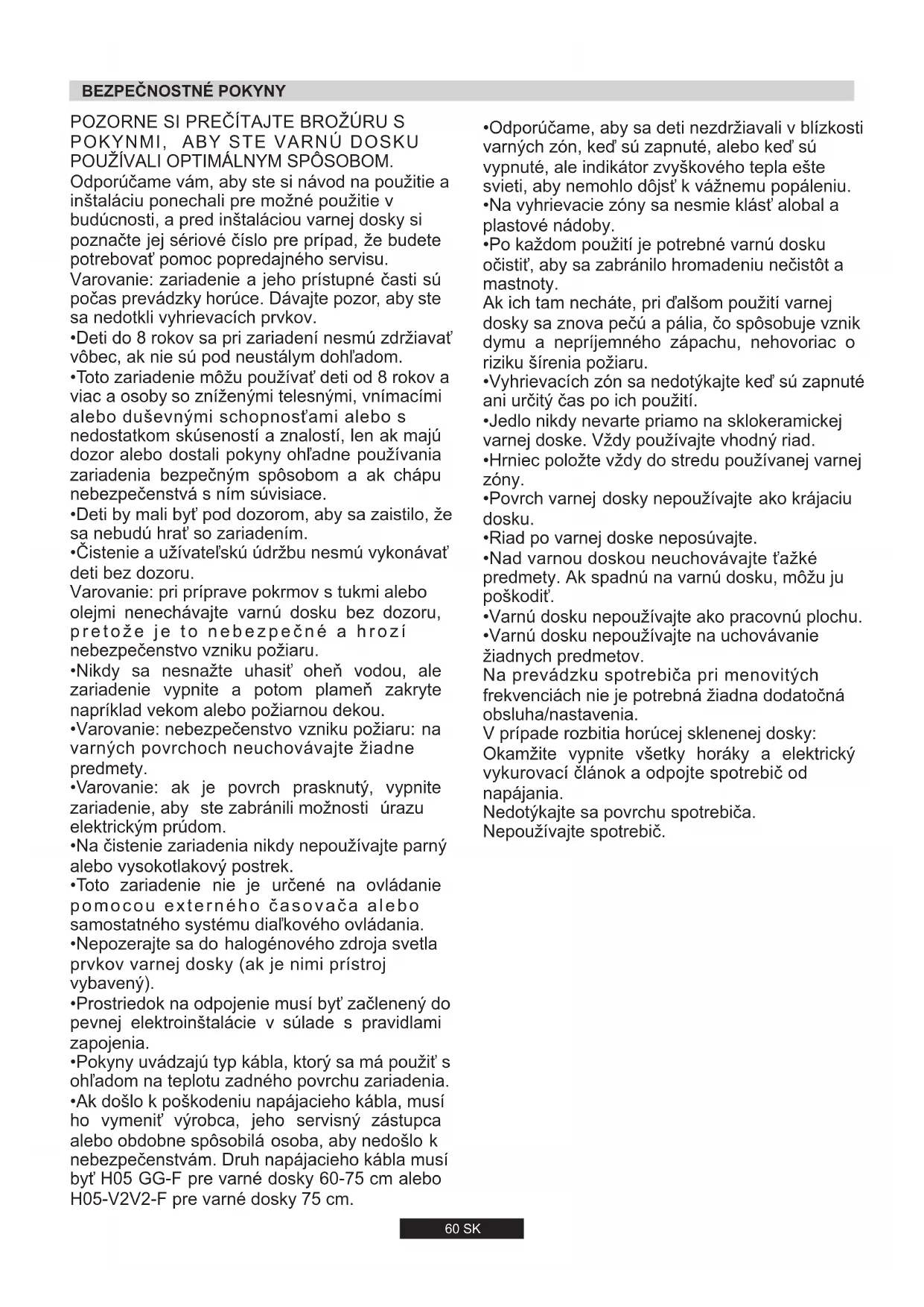 - Ak došlo k poškodeniu napájacieho kábla, musí ho vymeniť výrobca, jeho servisný zástupca alebo obdobne spôsobilá osoba, aby nedošlo k nebezpečenstvám. Druh napájacieho kábla musí byť H05 GG-F pre varné dosky 60-75 cm alebo H05-V2V2-F pre varné dosky 75 cm.
