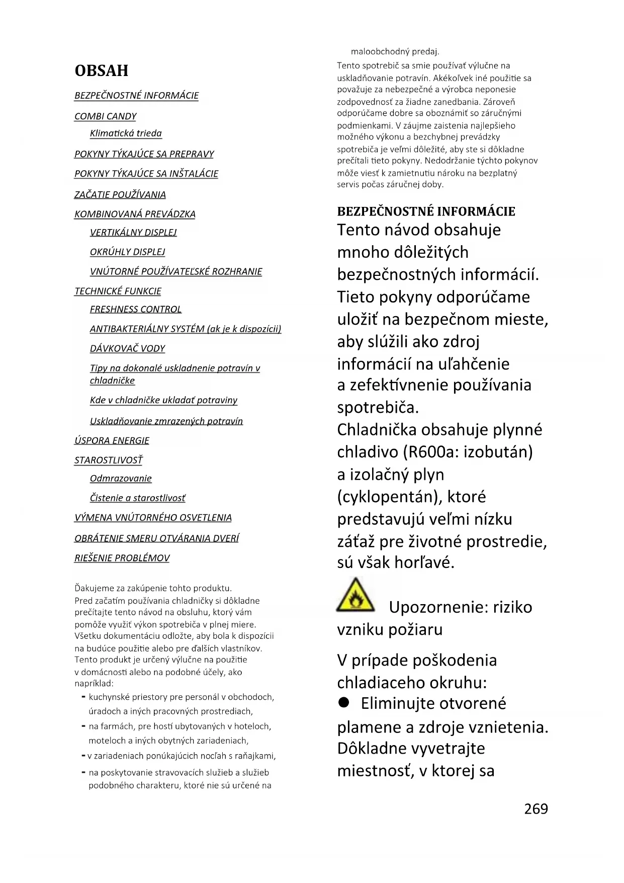 Termostate, temperaturna tipala, plošče tiskanega vezja in svetlobne vire za obdobje najmanj sedem let po tem, ko je bila dana na trg zadnja enota modela; kljuke in tečaje vrat, pladnje in košare za najmanj sedem let po tem, ko je bila dana na trg zadnja enota modela, tesnila vrat pa za najmanj deset let po tem; Za nadaljnje informacije o izdelku glejte https://eprel.ec.europa.eu/ ali skenirajte QR na energijski nalepki, priloženi napravi269 Slovenský OBSAH BEZPEČNOSTNÉ INFORMÁCIE COMBI CANDY Klimatická trieda POKYNY TÝKAJÚCE SA PREPRAVY POKYNY TÝKAJÚCE SA INŠTALÁCIE ZAČATIE POUŽÍVANIA KOMBINOVANÁ PREVÁDZKA VERTIKÁLNY DISPLEJ OKRÚHLY DISPLEJ VNÚTORNÉ POUŽÍVATEĽSKÉ ROZHRANIE TECHNICKÉ FUNKCIE FRESHNESS CONTROL ANTIBAKTERIÁLNY SYSTÉM (ak je k dispozícii) DÁVKOVAČ VODY Tipy na dokonalé uskladnenie potravín v chladničke Kde v chladničke ukladať potraviny Uskladňovanie zmrazených potravín ÚSPORA ENERGIE STAROSTLIVOSŤ Odmrazovanie Čistenie a starostlivosť VÝMENA VNÚTORNÉHO OSVETLENIA OBRÁTENIE SMERU OTVÁRANIA DVERÍ RIEŠENIE PROBLÉMOV Ďakujeme za zakúpenie tohto produktu. Pred začatím používania chladničky si dôkladne prečítajte tento návod na obsluhu, ktorý vám pomôže využiť výkon spotrebiča v plnej miere. Všetku dokumentáciu odložte, aby bola k dispozícii na budúce použitie alebo pre ďalších vlastníkov. Tento produkt je určený výlučne na použitie v domácnosti alebo na podobné účely, ako napríklad: - kuchynské priestory pre personál v obchodoch, úradoch a iných pracovných prostrediach, - na farmách, pre hostí ubytovaných v hoteloch, moteloch a iných obytných zariadeniach, - v zariadeniach ponúkajúcich nocľah s raňajkami, - na poskytovanie stravovacích služieb a služieb podobného charakteru, ktoré nie sú určené na maloobchodný predaj. Tento spotrebič sa smie používať výlučne na uskladňovanie potravín. Akékoľvek iné použitie sa považuje za nebezpečné a výrobca neponesie zodpovednosť za žiadne zanedbania. Zároveň odporúčame dobre sa oboznámiť so záručnými podmienkami. V záujme zaistenia najlepšieho možného výkonu a bezchybnej prevádzky spotrebiča je veľmi dôležité, aby ste si dôkladne prečítali tieto pokyny. Nedodržanie týchto pokynov môže viesť k zamietnutiu nároku na bezplatný servis počas záručnej doby.