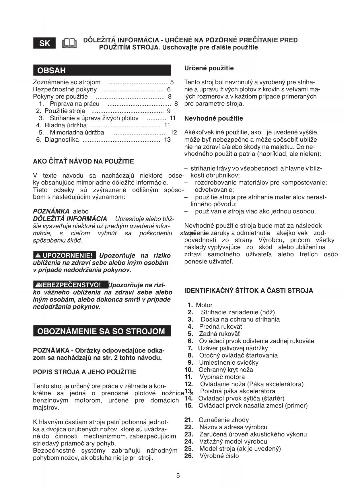 1) TENTO STROJ MÔŽE SPÔSOBIŤ VÁŽNE ŠKODY A UBLÍŽENIE NA ZDRAVÍ. Pozorne si prečítajte pokyny pre správne použitie, prí- pravu, údržbu, štartovanie a zastavenie stroja. Oboznámte sa s ovládacími prvkami stroja a so správnym spôsobom jeho použitia. Naučte sa rýchlo zastaviť motor. 2) Nikdy nepripusťte, aby stroj používali deti ale- bo osoby, ktoré nie sú dokonale oboznámené s pokynmi na jeho použitie. Miestne zákony môžu určiť minimálny vek pre užívateľa. 3) Stroj nesmie používať viac ako jedna osoba. 4) Nikdy nepoužívajte stroj za týchto podmie- nok: – ak sa v jeho blízkosti nachádzajú osoby, pre- dovšetkým deti alebo zvieratá; – keď je užívateľ unavený, alebo ak sa necí- ti dobre, alebo v prípade, ak užil lieky, drogy, alkohol alebo iné látky znižujúce jeho reex a pozornosť; – keď užívateľ nie je schopný udržať stroj pev- ne v obidvoch rukách a/alebo zostať v stabil- nej vyváženej polohe na nohách počas práce. 5) Pamätajte, že obsluha alebo užívateľ nesie zodpovednosť za nehody a nepredvídané uda- losti voči iným osobám a ich majetku.