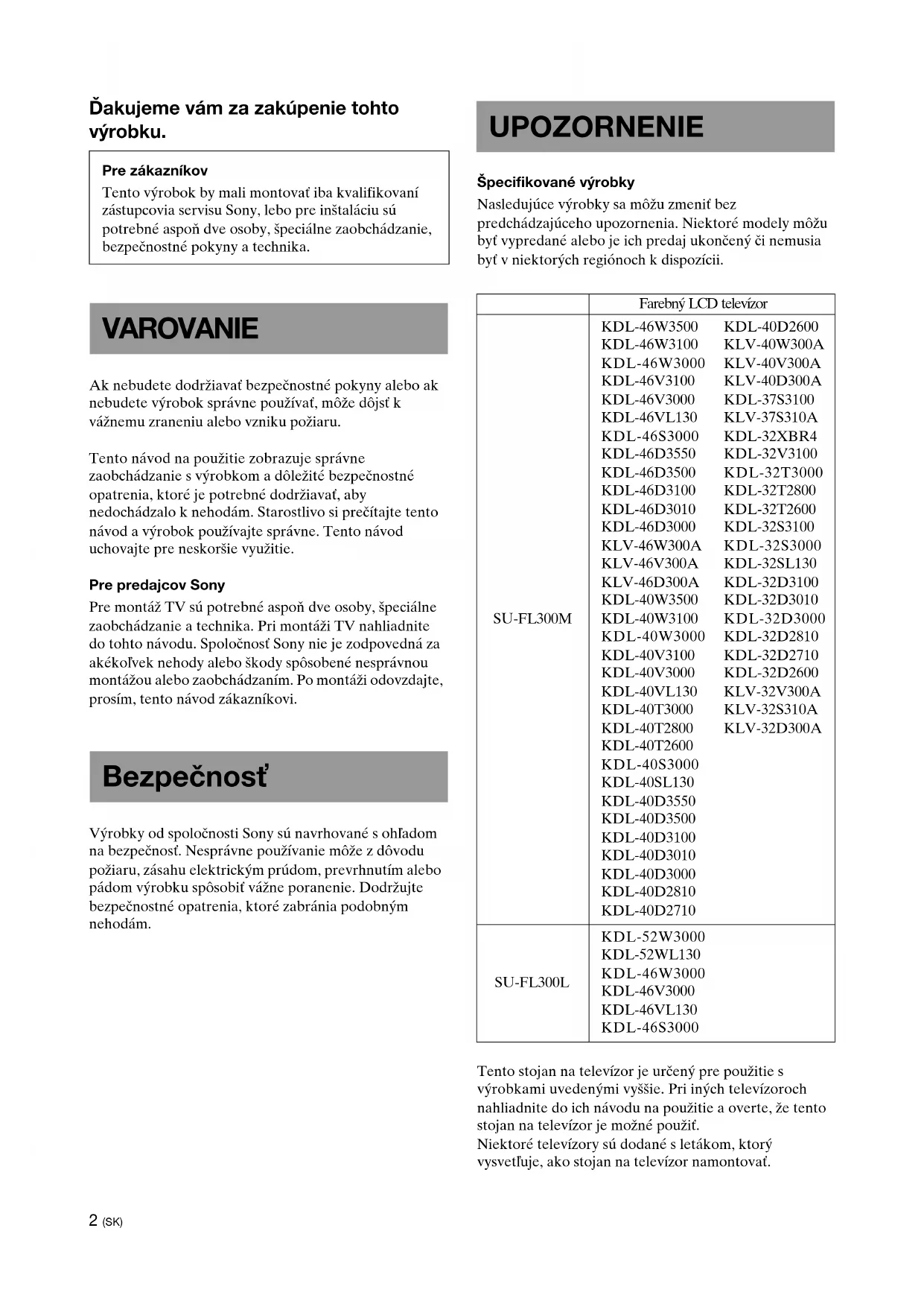 SU-FL300L KDL-52W3000 KDL-52WL130 KDL-46W3000 KDL-46V3000 KDL-46VL130 KDL-46S30003 (SK) Tento výrobok by mali montovať iba kvalifikovaní zástupcovia servisu Sony. Televízor aj stojan na televízor sú veľmi ťažké predmety; montáž vykonaná nekvalifikovanou osobou môže viesť k vážnemu poraneniu. Vykonajte taktiež opatrenia, aby ste zabránili prevrhnutiu stojana na televízor. Ak toto nezaistíte, môže sa televízor prevrátiť a spôsobiť zranenie. Pripevnite televízor k stene, atď., aby ste zabránili jeho prevrhnutiu. Stojan na televízor namontujte na pevnej, plochej podlahe. Nemontujte stojan na televízor tak, aby bol naklonený jedným smerom. Ak tak urobíte, stojan na televízor sa môže prevrhnúť alebo môže spadnúť televízor. To môže spôsobiť poranenie alebo škody. Ak namontujete stojan na televízor na mäkkom povrchu, ako napr. na rohoži alebo koberci, najprv na miesto montáže položte dosku. Nepoužívajte prasknutý stojan na televízor. Neopierajte sa o televízor, ani sa naň nevešajte. Stojan na televízor sa môže prevrhnúť alebo môže spadnúť televízor a spôsobiť vážne zranenie alebo smrť. Nedovoľte deťom liezť na stojan na televízor ani preliezať medzi poličkami. Ak deti lezú na stojan na televízor alebo medzi poličky, hrozia vážne poranenia alebo smrť spôsobené prasknutím skla alebo stojana na televízor a prevrhnutím televízora. Na stojan na televízor nestúpajte. Môžete spadnúť alebo rozbiť sklo a spôsobiť si tak poranenie. Nezakrývajte vetracie otvory na televízore. Ak vetracie otvory zakryjete (látkou, atď.), môže sa vo vnútri zvýšiť teplota a spôsobiť požiar. Zabráňte pricviknutiu napájacieho alebo prepájacieho kábla.