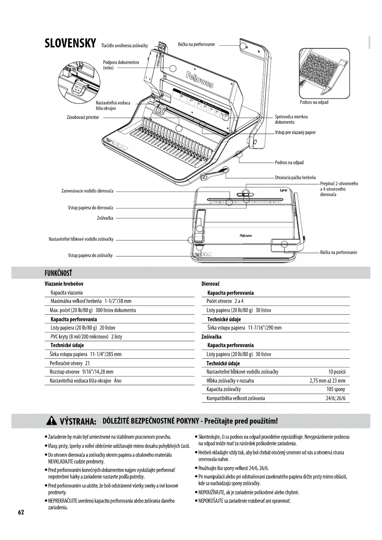 Kedykoľvek môžete pridať alebo odstrániť ďalšie hárky tak, že otvoríte a potom zavriete hrebeň podľa uvedeného postupu.65 ODSTRÁNENIE NADBYTOČNÝCH ODPADOVÝCH KÚSKOV PAPIERA Podnos na odpadsa nachádza pod zariadením a je prístupný z pravej strany. Podnos na odpad pravidelne vyprázdňujte. SKLADOVANIE Sklopte rúčku na perforovanie do vodorovnej polohy. Sklopte kryt. Viazacie zariadenia Lyra sú navrhnuté tak, aby sa mohli skladovať vodorovne na pracovnej ploche. ZÁRUKA Spoločnosť Fellowes, Inc. zaručuje, že všetky súčasti zariadenia budú bez chýb materiálu a výrobnýchchýb po dobu 2 rokov od dátumu nákupu pôvodným spotrebiteľom. Ak sa počas záručnej lehoty zistí chyba ktorejkoľvek časti, vaše výhradné a jediné nápravné opatrenie bude oprava alebo výmena chybnej časti na náklady spoločnosti Fellowes, podľa ich uváženia. Táto záruka neplatí v prípadoch nesprávneho použitia, nesprávnej manipulácie, nedodržania noriem používania výrobku, prevádzky s použitím nesprávneho zdroja napájania (iného než uvedeného na štítku) alebo neoprávnenej opravy. Spoločnosť Fellowes si vyhradzuje právo účtovať spotrebiteľom všetky ďalšie náklady, ktoré jej vzniknú v súvislosti s poskytnutím náhradných dielov alebo servisu mimo krajiny pôvodného predaja zariadenia autorizovaným predajcom. KAŽDÁ VYPLÝVAJÚCA ZÁRUKA VRÁTANE ZÁRUKY PREDAJNOSTI ALEBO SPÔSOBILOSTI PRE URČITÝ ÚČEL JE TÝMTO OBMEDZENÁ NA TRVANIE PRIMERANEJ ZÁRUČNEJ LEHOTY VYSVETLENEJ VYŠŠIE. Spoločnosť Fellowes nebude v žiadnom prípade zodpovedná za prípadné následné alebo vedľajšie škody prisudzované tomuto výrobku. Táto záruka vám poskytuje určité zákonné práva. Môžete mať iné zákonné práva, ktoré sa líšia od tejto záruky. Trvanie, termíny a podmienky tejto záruky platia celosvetovo, okrem prípadov, kde miestne zákony ukladajú rôzne obmedzenia, reštrikcie alebo podmienky. So žiadosťou o ďalšie informácie alebo záručný servis sa obráťte na spoločnosť Fellowes alebo vášho predajcu.