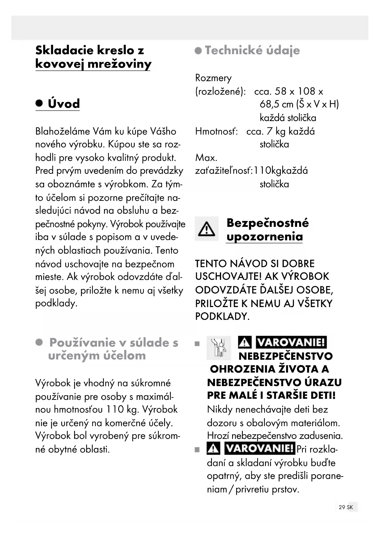 PRE MALÉ I STARŠIE DETI! Nikdy nenechávajte deti bez dozoru s obalovým materiálom. Hrozí nebezpečenstvo zadusenia. Pri rozkla- daní a skladaní výrobku buďte opatrný, aby ste predišli porane- niam / privretiu prstov.30 SK Pred každým použitím výrobok skontrolujte ohľadom poškodení alebo opotrebovania. Výrobok používajte, iba ak je v bezchybnom stave. Výrobok nepoužívajte, ak vidíte alebo predpokladáte akékoľvek poškodenia. Pred používaním skontrolujte správnu stabilitu výrobku. Pred používaním postavte výro- bok na rovný, pevný podklad, inak môže byť nestabilný a prevrátiť sa nabok. Môže to viesť k poraneniam alebo k vzni- ku vecných škôd. 11 0 kg Neprekračujte maximál- nu zaťažiteľnosť 110 kg. Prekročenie hmotnostnej hranice môže viesť k poraneniam a/ale- bo k vzniku vecných škôd. Dbajte na to, aby sa Vaše ruky nedostali do sklápacieho zaria- denia, aby ste predišli porane- niam. Pri rozkladaní dbajte na to, aby vyklápací mechanizmus správne zapadol predtým, ako budete výrobok používať. Dbajte na to, aby bol výrobok pred používaním úplne otvorený. Výrobok nie je hračka a mal by byť používaný iba pod dozorom dospelej osoby. Výrobok smie vždy používať iba jedna osoba. Nikdy si nesadajte na chrbtovú opierku, lakťové opierky alebo opierku pre nohy (ak je prítomná). Nestavajte na výrobok. Pri extrémnych poveternostných podmienkach, napr. pri silnom vetre, zaistite výrobok. Výrobok nepoužívajte v blízkosti otvoreného ohňa.