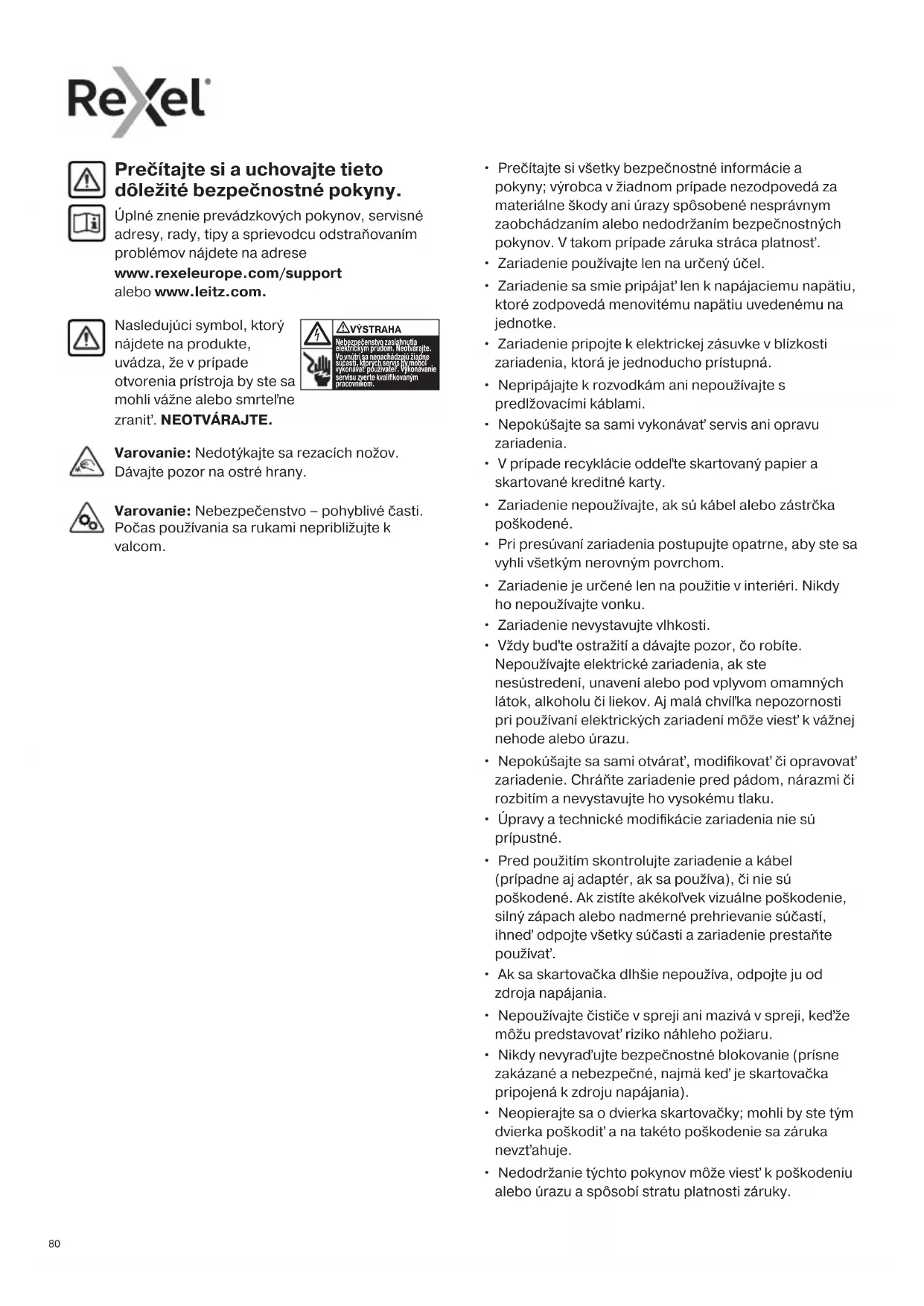 - Nedodržanie týchto pokynov môže viesť k poškodeniu alebo úrazu a spôsobí stratu platnosti záruky. Prečítajte si a uchovajte tieto dôležité bezpečnostné pokyny. Úplné znenie prevádzkových pokynov, servisné adresy, rady, tipy a sprievodcu odstraňovaním problémov nájdete na adrese www.rexeleurope.com/support alebo www.leitz.com. Varovanie: Nedotýkajte sa rezacích nožov. Dávajte pozor na ostré hrany. Varovanie: Nebezpečenstvo – pohyblivé časti. Počas používania sa rukami nepribližujte k valcom.818181 Nepribližujte sa s voľnými šperkami Nepribližujte sa s kravatami a voľnými odevmi Výstražné symboly Nepribližujte sa s dlhými vlasmi Nevkladajte ruky do podávacieho otvoru zariadenia Výstražné symboly Maximálny počet hárkov Nevkladať CD Nevkladať pevné zošívacie svorky nad 26 mm Varovanie: pohyblivé časti Toto zariadenie nie je určené na používanie deťmi Zákaz aerosólov. Nepoužívajte čističe v spreji ani mazivá v spreji, keďže môžu predstavovať riziko náhleho požiaru. Ikona Typ Posuvný prepínač/ indikátor a úkon Ovládacie tlačidlá Tlačidlo automatického spustenia a pohotovostného režimu (stlačte raz) Manuálne tlačidlo Späť (podržte) Manuálne tlačidlo Vpred (podržte) Indikátor prehriatia (nechajte skartovačku vychladnúť) Zariadenie preplnené/ zaseknuté hárky (vložte menší počet hárkov/ vyberte zaseknuté hárky) Tlačidlo/indikácia aúkon Ikona Typ Posuvný prepínač/ indikátor a úkon Posuvný prepínač Automatické spustenie (posuňte do skartovacej pozície) Spätný chod (posuňte do pozície) Dopredu (posuňte do pozície) Indikátory stavu Vypnúť (posuňte do pozície) Indikátor pripravenosti (skartovacia hlava musí byť umiestnená na koši a posuvný prepínač v polohe Automatické spustenie) Indikátor prehriatia (nechajte skartovačku vychladnúť) Ovládacie prvky a indikátory Modely s posuvným prepínačom Neskartujte kreditné karty Príslušenstvo Používajte výhradne príslušenstvo značky Rexel: Olejové hárky (20) - 2101949 Olejové hárky (12) - 210194882 Hrubý papier alebo kartón < 200 g/m². Viaceré zložené hárky (hárky A3 zložené napoly). Lesklý papier alebo hárok potlačený na oboch stranách. Disky CD a DVD. Zákaz aerosólov Žiadny olej, iba olejové listy Možnosti skartovania Zariadenie UMOŽŇUJE skartovať: