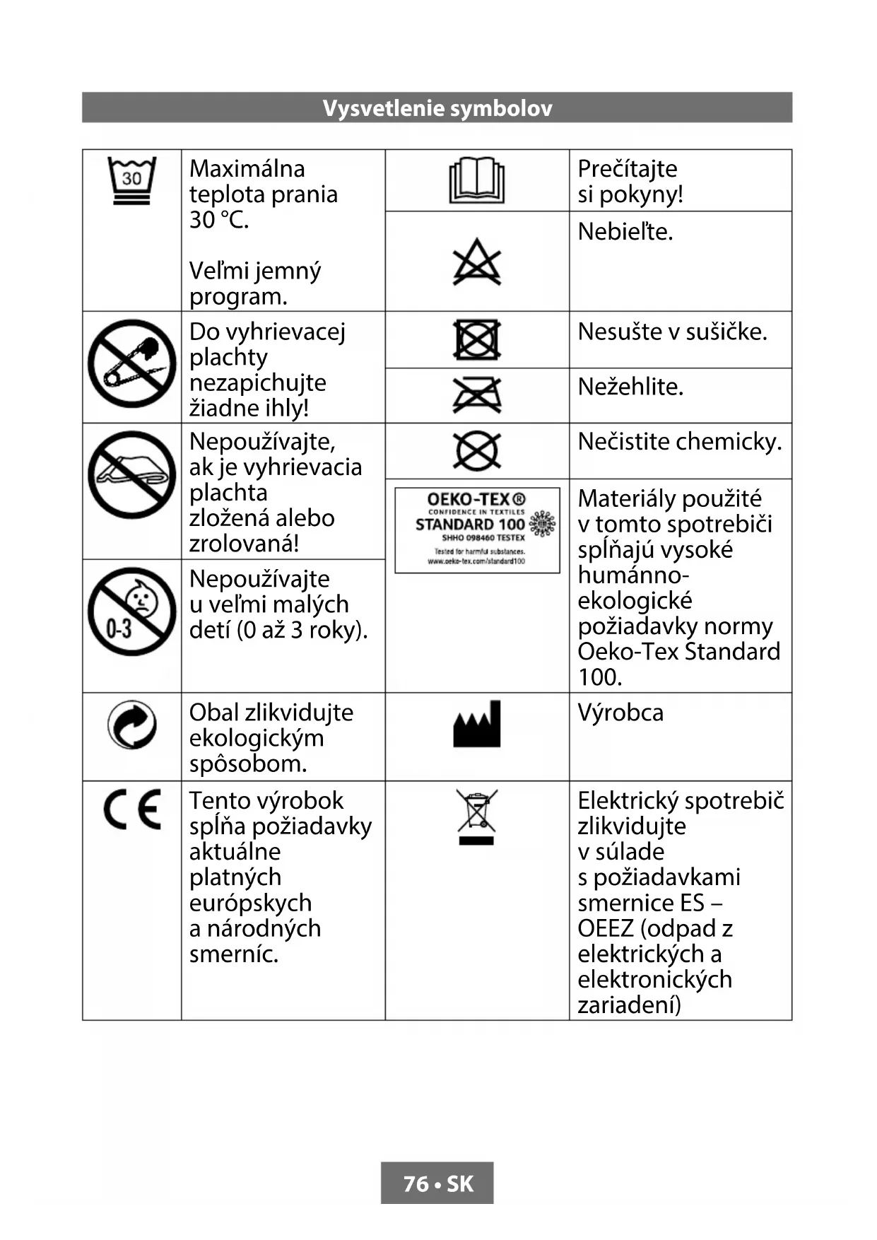 Nepoužívajte u veľmi malých detí (0 až 3 roky). Obal zlikvidujte ekologickým spôsobom. Výrobca Tento výrobok spĺňa požiadavky aktuálne platných európskych a národných smerníc. Elektrický spotrebič zlikvidujte v súlade s požiadavkami smernice ES – OEEZ (odpad z elektrických a elektronických zariadení) 76 • SK Vysvetlenie symbolovSpotrebič je vybavený dvojitou izoláciou a zodpovedá stupňu ochrany krytom 2. Elektrická plachta je vhodná pre 1 osobu. VAROVANIE: varovanie pred rizikom zranenia alebo nebezpečenstvom pre vaše zdravie. POZOR: bezpečnostné upozornenie pred možným poškodením spotrebiča alebo príslušenstva. UPOZORNENIE: upozornenie na dôležité informácie. 77 • SK78 • SK Bezpečnostné predpisy Dôležité bezpečnostné pokyny – pozorne si ich prečítajte a uschovajte na neskoršie použitie! VAROVANIE