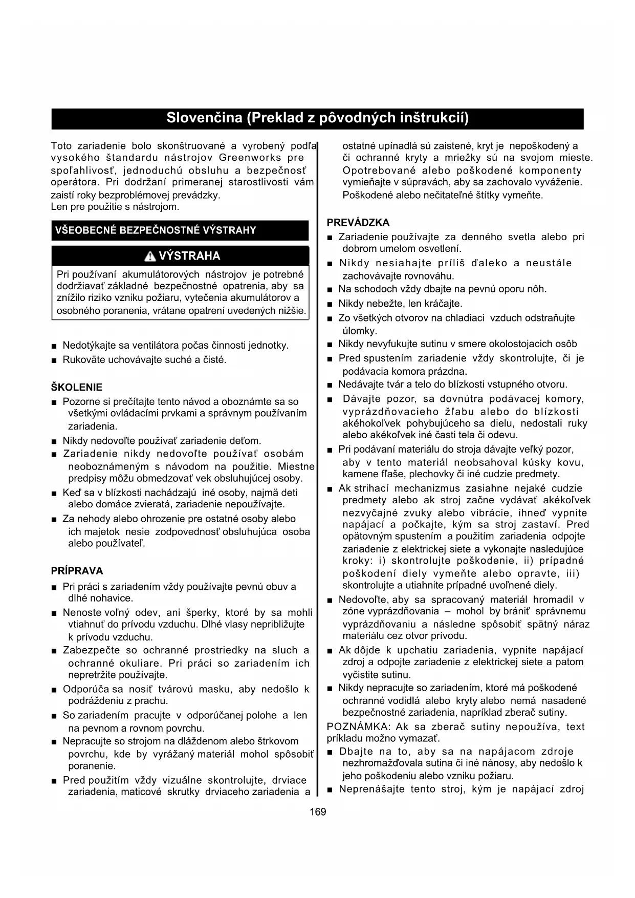 Slovenčina (Preklad z pôvodných inštrukcií) Toto zariadenie bolo skonštruované a vyrobený podľa vysokého štandardu nástrojov Greenworks pre spoľahlivosť, jednoduchú obsluhu a bezpečnosť operátora. Pri dodržaní primeranej starostlivosti vám zaistí roky bezproblémovej prevádzky. Len pre použitie s nástrojom. VŠEOBECNÉBEZPEČNOSTNÉVýSTRAHY VýSTRAHA Pri používaní akumulátorových nástrojov je potrebné dodržiavať základné bezpečnostné opatrenia, aby sa znížilo riziko vzniku požiaru, vytečenia akumulátorov a osobného poranenia, vrátane opatrení uvedených nižšie. ■ Nedotýkajte sa ventilátora počas činnosti jednotky. ■ Rukoväte uchovávajte suché a čisté. ŠkOlENIE ■ Pozorne si prečítajte tento návod a oboznámte sa so všetkými ovládacími prvkami a správnym používaním zariadenia. ■ Nikdy nedovoľte používať zariadenie deťom. ■ Zariadenie nikdy nedovoľte používať osobám neoboznámeným s návodom na použitie. Miestne predpisy môžu obmedzovať vek obsluhujúcej osoby. ■ Keď sa v blízkosti nachádzajú iné osoby, najmä deti alebo domáce zvieratá, zariadenie nepoužívajte. ■ Za nehody alebo ohrozenie pre ostatné osoby alebo ich majetok nesie zodpovednosť obsluhujúca osoba alebo používateľ. PRÍPRAVA ■ Pri práci s zariadením vždy používajte pevnú obuv a dlhé nohavice. ■ Nenoste voľný odev, ani šperky, ktoré by sa mohli vtiahnuť do prívodu vzduchu. Dlhé vlasy nepribližujte k prívodu vzduchu. ■ Zabezpečte so ochranné prostriedky na sluch a ochranné okuliare. Pri práci so zariadením ich nepretržite používajte. ■ Odporúča sa nosiť tvárovú masku, aby nedošlo k podráždeniu z prachu. ■ So zariadením pracujte v odporúčanej polohe a len na pevnom a rovnom povrchu. ■ Nepracujte so strojom na dláždenom alebo štrkovom povrchu, kde by vyrážaný materiál mohol spôsobiť poranenie. ■ Pred použitím vždy vizuálne skontrolujte, drviace zariadenia, maticové skrutky drviaceho zariadenia a ostatné upínadlá sú zaistené, kryt je nepoškodený a či ochranné kryty a mriežky sú na svojom mieste. Opotrebované alebo poškodené komponenty vymieňajte v súpravách, aby sa zachovalo vyváženie. Poškodené alebo nečitateľné štítky vymeňte. PREVÁDZkA ■ Zariadenie používajte za denného svetla alebo pri dobrom umelom osvetlení. ■ Nikdy nesiahajte príliš ďaleko a neustále zachovávajte rovnováhu. ■ Na schodoch vždy dbajte na pevnú oporu nôh. ■ Nikdy nebežte, len kráčajte. ■ Zo všetkých otvorov na chladiaci vzduch odstraňujte úlomky. ■ Nikdy nevyfukujte sutinu v smere okolostojacich osôb ■ Pred spustením zariadenie vždy skontrolujte, či je podávacia komora prázdna. ■ Nedávajte tvár a telo do blízkosti vstupného otvoru. ■ Dávajte pozor, sa dovnútra podávacej komory, vyprázdňovacieho žľabu alebo do blízkosti akéhokoľvek pohybujúceho sa dielu, nedostali ruky alebo akékoľvek iné časti tela či odevu. ■ Pri podávaní materiálu do stroja dávajte veľký pozor, aby v tento materiál neobsahoval kúsky kovu, kamene fľaše, plechovky či iné cudzie predmety. ■ Ak strihací mechanizmus zasiahne nejaké cudzie predmety alebo ak stroj začne vydávať akékoľvek nezvyčajné zvuky alebo vibrácie, ihneď vypnite napájací a počkajte, kým sa stroj zastaví. Pred opätovným spustením a použitím zariadenia odpojte zariadenie z elektrickej siete a vykonajte nasledujúce kroky: i) skontrolujte poškodenie, ii) prípadné poškodení diely vymeňte alebo opravte, iii) skontrolujte a utiahnite prípadné uvoľnené diely. ■ Nedovoľte, aby sa spracovaný materiál hromadil v zóne vyprázdňovania – mohol by brániť správnemu vyprázdňovaniu a následne spôsobiť spätný náraz materiálu cez otvor prívodu. ■ Ak dôjde k upchatiu zariadenia, vypnite napájací zdroj a odpojte zariadenie z elektrickej siete a patom vyčistite sutinu. ■ Nikdy nepracujte so zariadením, ktoré má poškodené ochranné vodidlá alebo kryty alebo nemá nasadené bezpečnostné zariadenia, napríklad zberač sutiny. POZNÁMKA: Ak sa zberač sutiny nepoužíva, text príkladu možno vymazať. ■ Dbajte na to, aby sa na napájacom zdroje nezhromažďovala sutina či iné nánosy, aby nedošlo k jeho poškodeniu alebo vzniku požiaru. ■ Neprenášajte tento stroj, kým je napájací zdroj170 Английски (оригинални инструкции)