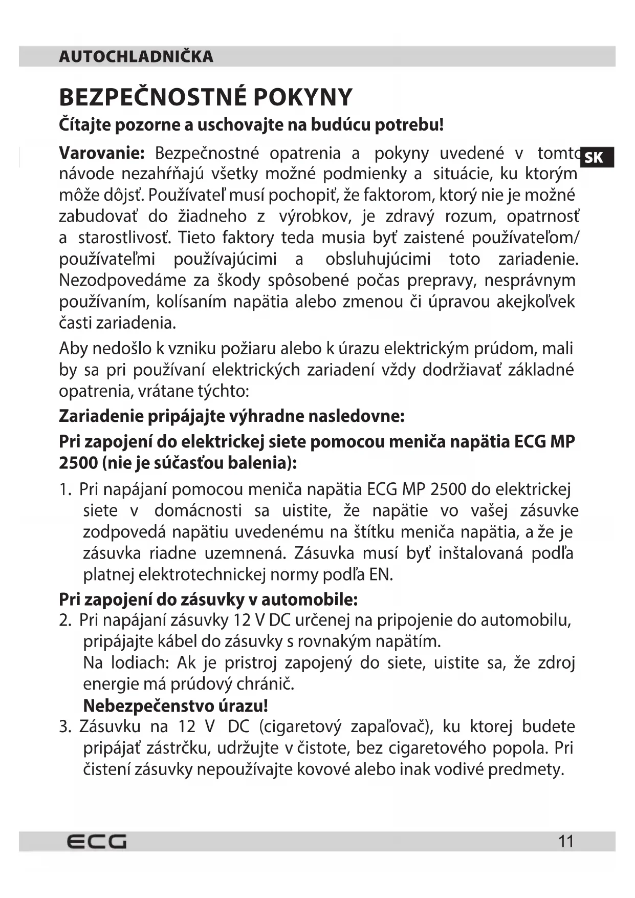Čítajte pozorne auschovajte na budúcu potrebu! Varovanie: Bezpečnostné opatrenia a pokyny uvedené v tomto návode nezahŕňajú všetky možné podmienky a situácie, ku ktorým môže dôjsť. Používateľ musí pochopiť, že faktorom, ktorý nie je možné zabudovať do žiadneho z výrobkov, je zdravý rozum, opatrnosť a starostlivosť. Tieto faktory teda musia byť zaistené používateľom/ používateľmi používajúcimi a obsluhujúcimi toto zariadenie. Nezodpovedáme za škody spôsobené počas prepravy, nesprávnym používaním, kolísaním napätia alebo zmenou či úpravou akejkoľvek časti zariadenia. Aby nedošlo kvzniku požiaru alebo kúrazu elektrickým prúdom, mali by sa pri používaní elektrických zariadení vždy dodržiavať základné opatrenia, vrátane týchto: Zariadenie pripájajte výhradne nasledovne: Pri zapojení do elektrickej siete pomocou meniča napätia ECG MP 2500 (nie je súčasťou balenia):