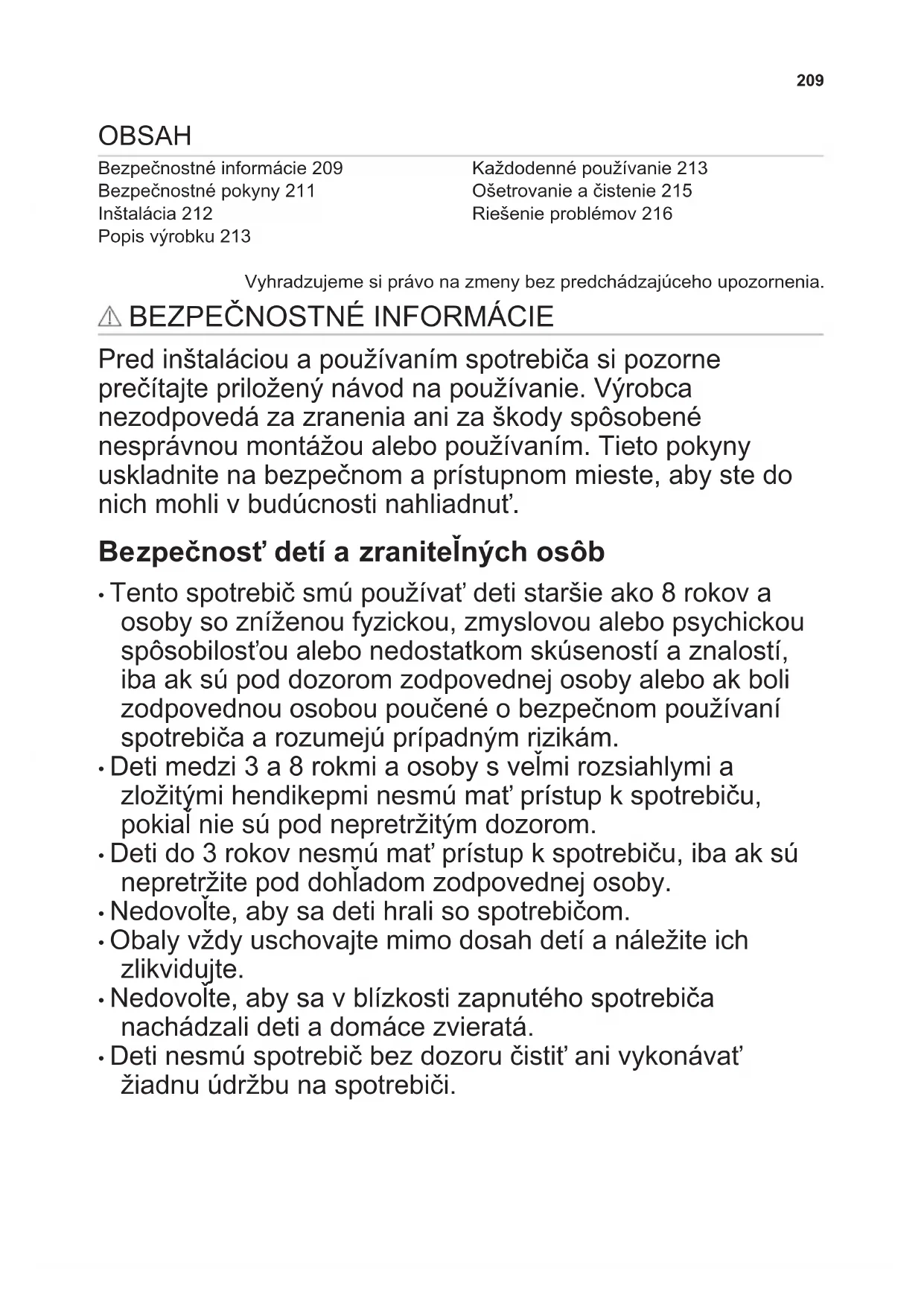 - Deti nesmú spotrebič bez dozoru čistiť ani vykonávať žiadnu údržbu na spotrebiči. 209Všeobecná bezpečnosť