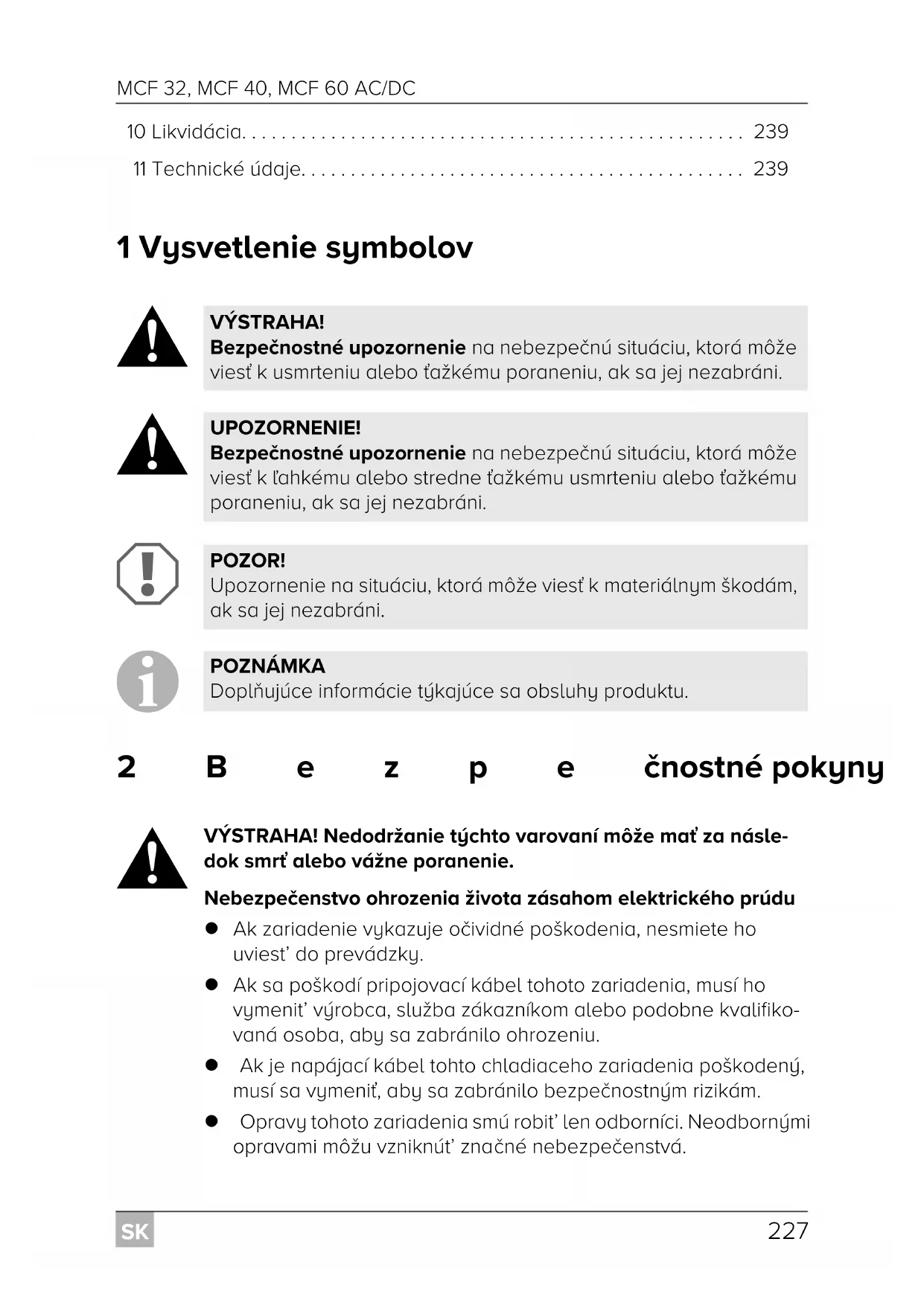 - Pred uvedením zariadenia do prevádzky si prosím pozorne prečítajte tento návod a odložte si ho. V prípade odovzdania chladiaceho zariadenia ďal- šiemu používateľovi mu odovzdajte aj tento návod. Výrobca neručí za škody, ktoré vzniknú používaním, ktoré nie je v súlade surčeným použitím alebo boli spôsobené nesprávnou obsluhou. Obsah 1 Vysvetlenie symbolov p. 227