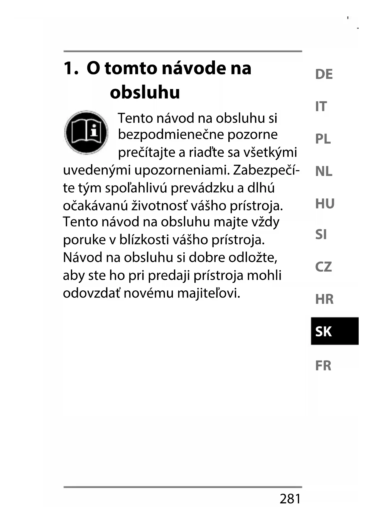 obsluhu Tento návod na obsluhu si bezpodmienečne pozorne prečítajte a riaďte sa všetkými uvedenými upozorneniami. Zabezpečí- te tým spoľahlivú prevádzku a dlhú očakávanú životnosť vášho prístroja. Tento návod na obsluhu majte vždy poruke v blízkosti vášho prístroja. Návod na obsluhu si dobre odložte, aby ste ho pri predaji prístroja mohli odovzdať novému majiteľovi.282 1.1. Vysvetlenie značiek NEBEZPEČENSTVO! Výstraha pred bez- prostredným ohroze- ním života! VÝSTRAHA! Výstraha pred mož- ným ohrozením života alebo pred ťažkým ne- zvratným poranením! OPATRNE! Výstraha pred možným stredne ťažkým alebo ľahkým poranením!DE