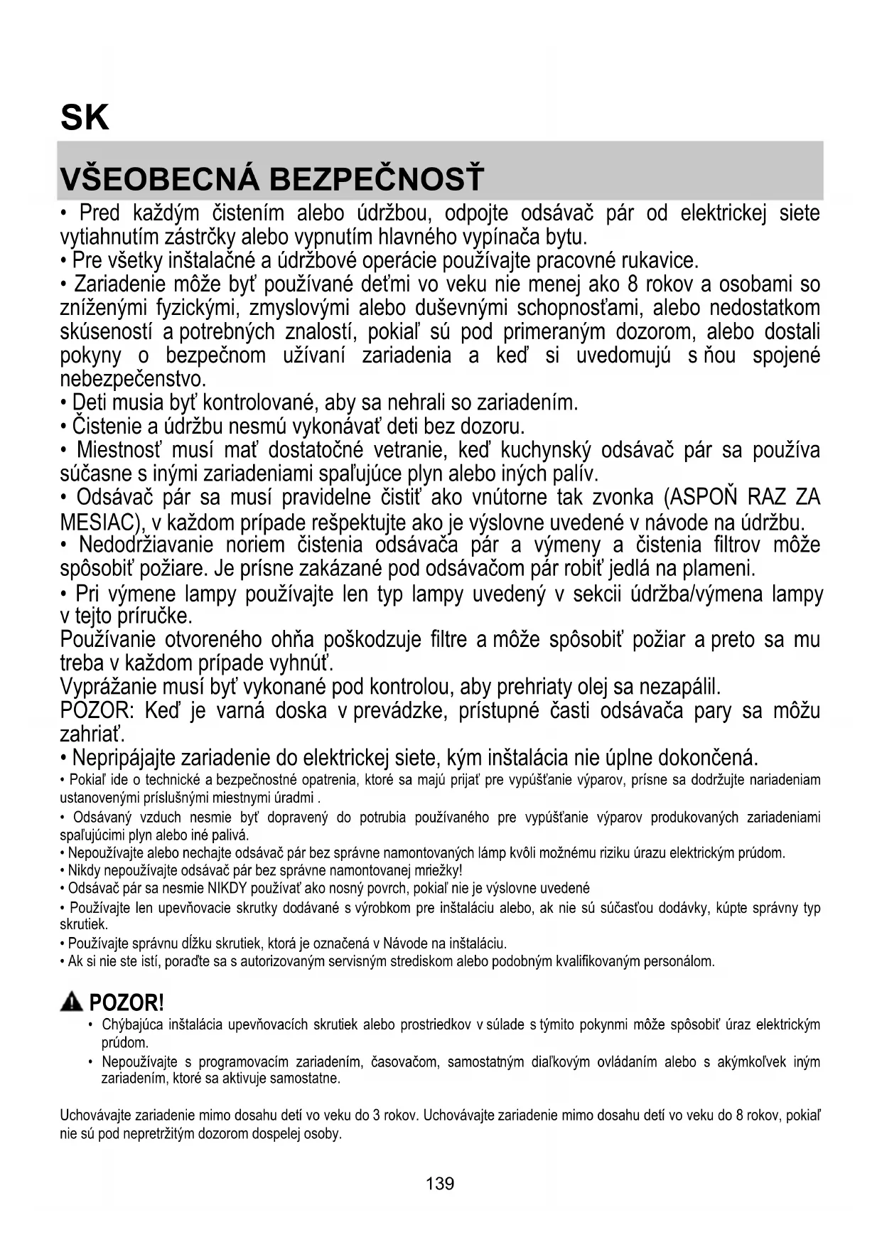 - Pri výmene lampy používajte len typ lampy uvedený v sekcii údržba/výmena lampy v tejto príručke. Používanie otvoreného ohňa poškodzuje filtre a môže spôsobiť požiar a preto sa mu treba v každom prípade vyhnúť. Vyprážanie musí byť vykonané pod kontrolou, aby prehriaty olej sa nezapálil. POZOR: Keď je varná doska v prevádzke, prístupné časti odsávača pary sa môžu zahriať.