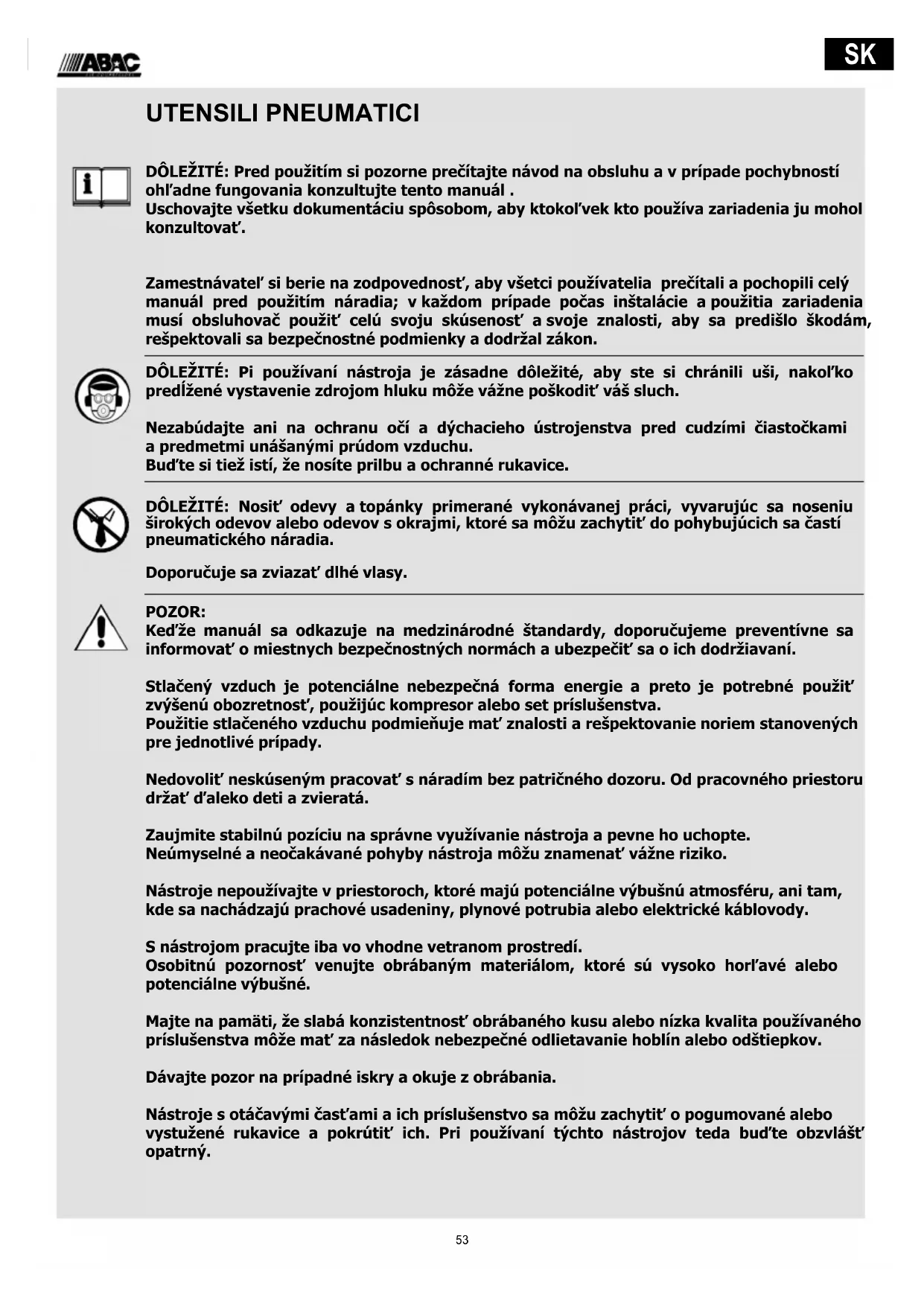 UTENSILI PNEUMATICI DÔLEŽITÉ: Pred použitím si pozorne prečítajte návod na obsluhu a v prípade pochybností ohľadne fungovania konzultujte tento manuál . Uschovajte všetku dokumentáciu spôsobom, aby ktokoľvek kto používa zariadenia ju mohol konzultovať. Zamestnávateľ si berie na zodpovednosť, aby všetci používatelia prečítali a pochopili celý manuál pred použitím náradia; v každom prípade počas inštalácie a použitia zariadenia musí obsluhovač použiť celú svoju skúsenosť a svoje znalosti, aby sa predišlo škodám, rešpektovali sa bezpečnostné podmienky a dodržal zákon. DÔLEŽITÉ: Pi používaní nástroja je zásadne dôležité, aby ste si chránili uši, nakoľko predĺžené vystavenie zdrojom hluku môže vážne poškodiť váš sluch. Nezabúdajte ani na ochranu očí a dýchacieho ústrojenstva pred cudzími čiastočkami a predmetmi unášanými prúdom vzduchu. Buďte si tiež istí, že nosíte prilbu a ochranné rukavice. DÔLEŽITÉ: Nosiť odevy a topánky primerané vykonávanej práci, vyvarujúc sa noseniu širokých odevov alebo odevov s okrajmi, ktoré sa môžu zachytiť do pohybujúcich sa častí pneumatického náradia. Doporučuje sa zviazať dlhé vlasy. POZOR: Keďže manuál sa odkazuje na medzinárodné štandardy, doporučujeme preventívne sa informovať o miestnych bezpečnostných normách a ubezpečiť sa o ich dodržiavaní. Stlačený vzduch je potenciálne nebezpečná forma energie a preto je potrebné použiť zvýšenú obozretnosť, použijúc kompresor alebo set príslušenstva. Použitie stlačeného vzduchu podmieňuje mať znalosti a rešpektovanie noriem stanovených pre jednotlivé prípady. Nedovoliť neskúseným pracovať s náradím bez patričného dozoru. Od pracovného priestoru držať ďaleko deti a zvieratá. Zaujmite stabilnú pozíciu na správne využívanie nástroja a pevne ho uchopte. Neúmyselné a neočakávané pohyby nástroja môžu znamenať vážne riziko. Nástroje nepoužívajte v priestoroch, ktoré majú potenciálne výbušnú atmosféru, ani tam, kde sa nachádzajú prachové usadeniny, plynové potrubia alebo elektrické káblovody. S nástrojom pracujte iba vo vhodne vetranom prostredí. Osobitnú pozornosť venujte obrábaným materiálom, ktoré sú vysoko horľavé alebo potenciálne výbušné. Majte na pamäti, že slabá konzistentnosť obrábaného kusu alebo nízka kvalita používaného príslušenstva môže mať za následok nebezpečné odlietavanie hoblín alebo odštiepkov. Dávajte pozor na prípadné iskry a okuje z obrábania. Nástroje s otáčavými časťami a ich príslušenstvo sa môžu zachytiť o pogumované alebo vystužené rukavice a pokrútiť ich. Pri používaní týchto nástrojov teda buďte obzvlášť opatrný.54