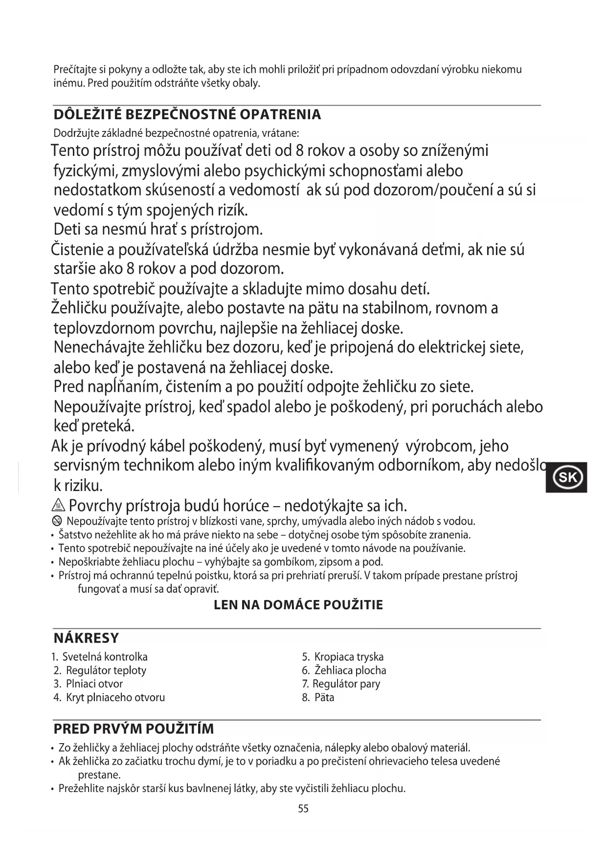 Dodržujte základné bezpečnostné opatrenia, vrátane: Tento prístroj môžu používať deti od 8 rokov a osoby so zníženými fyzickými, zmyslovými alebo psychickými schopnosťami alebo nedostatkom skúseností a vedomostí ak sú pod dozorom/poučení a sú si vedomí s tým spojených rizík. Deti sa nesmú hrať s prístrojom. Čistenie a používateľská údržba nesmie byť vykonávaná deťmi, ak nie sú staršie ako 8 rokov a pod dozorom. Tento spotrebič používajte a skladujte mimo dosahu detí. Žehličku používajte, alebo postavte na pätu na stabilnom, rovnom a teplovzdornom povrchu, najlepšie na žehliacej doske. Nenechávajte žehličku bez dozoru, keď je pripojená do elektrickej siete, alebo keď je postavená na žehliacej doske. Pred napĺňaním, čistením a po použití odpojte žehličku zo siete. Nepoužívajte prístroj, keď spadol alebo je poškodený, pri poruchách alebo keď preteká. Ak je prívodný kábel poškodený, musí byť vymenený výrobcom, jeho servisným technikom alebo iným kvalikovaným odborníkom, aby nedošlo k riziku. h Povrchy prístroja budú horúce – nedotýkajte sa ich. b Nepoužívajte tento prístroj v blízkosti vane, sprchy, umývadla alebo iných nádob s vodou.