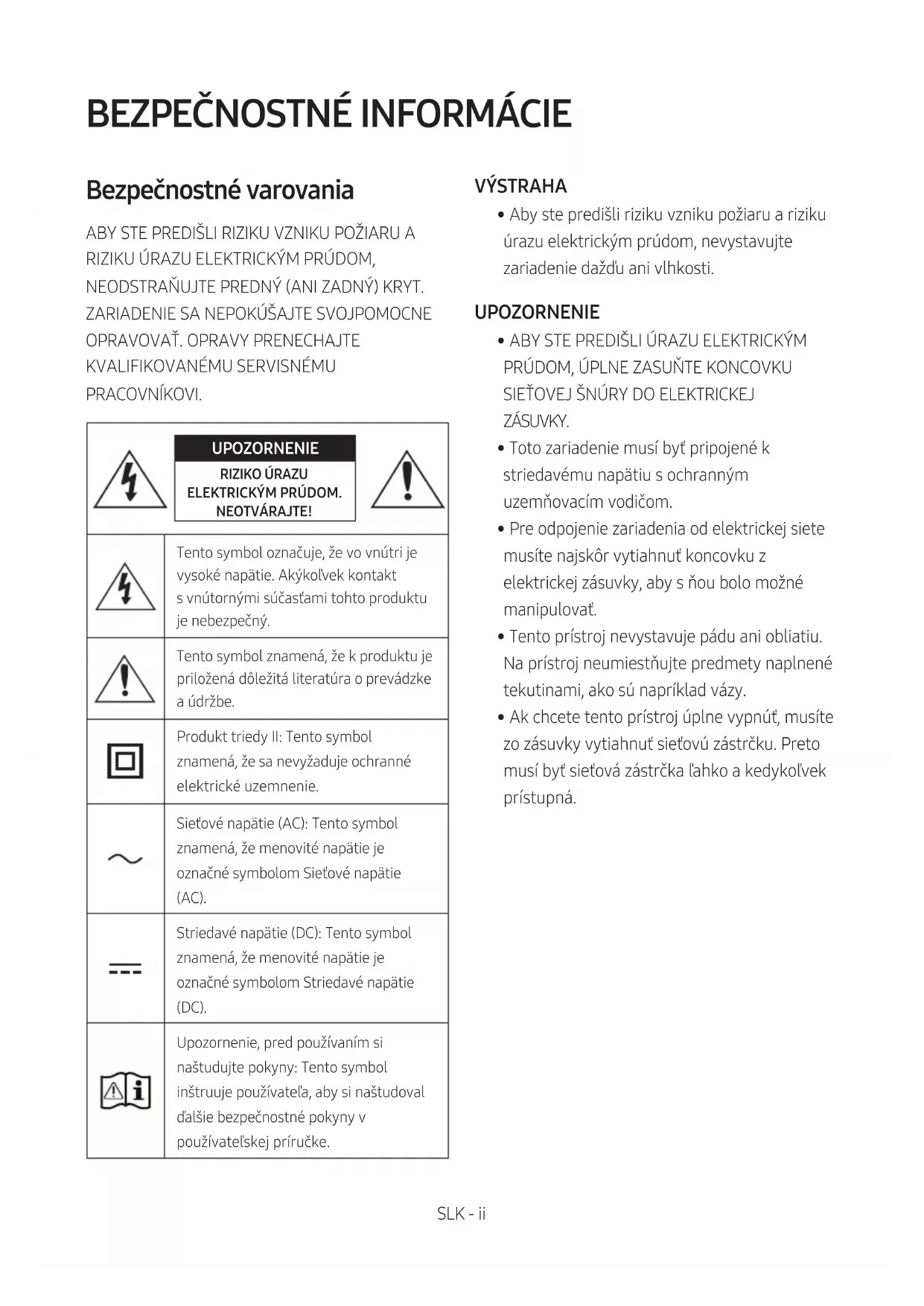 - Ak chcete tento prístroj úplne vypnúť, musíte zo zásuvky vytiahnuť sieťovú zástrčku. Preto musí byť sieťová zástrčka ľahko a kedykoľvek prístupná.SLK - iii BEZPEČNOSTNÉ OPATRENIA