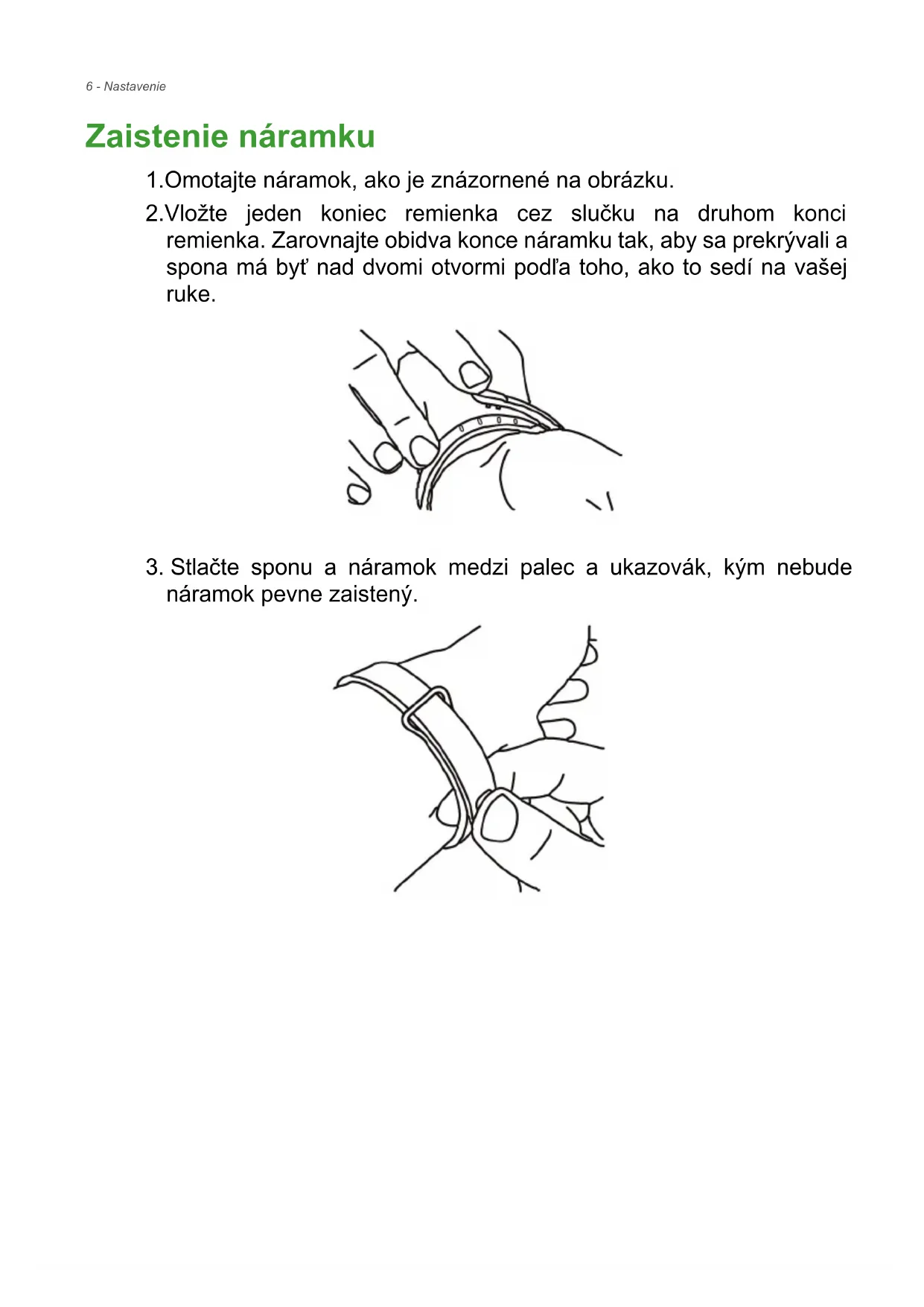 - USB kábel Nabíjanie batérie Pri prvom použití je potrebné zariadenie Leap úplne nabiť. zariadenie Leap sa nabije doplna približne za 90 minút. Po prvom nabití môžete nabíjať podľa potreby. 1.Vložte zariadenie Leap do kolísky, zarovnajte správne nabíjacie konektory. Zaistite, aby zariadenie Leap do kolísky zacvaklo.Nastavenie - 5 2.Pomocou priloženého kábla USB pripojte kolísku k počítaču. 3.Nabíjajte zariadenie Leap asi 90 minút, kým nebude nabitý doplna. Priebeh nabíjania môžete sledovať na obrazovke. Poznámka Dvojitým klepnutím na obrazovku zobrazíte úroveň nabitia.6 - Nastavenie Zaistenie náramku 1.Omotajte náramok, ako je znázornené na obrázku. 2.Vložte jeden koniec remienka cez slučku na druhom konci remienka. Zarovnajte obidva konce náramku tak, aby sa prekrývali a spona má byť nad dvomi otvormi podľa toho, ako to sedí na vašej ruke.