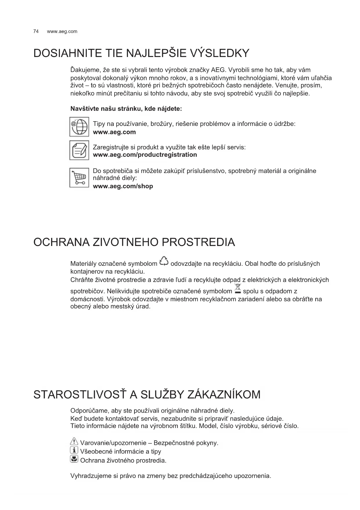 Materiály označené symbolom odovzdajte na recykláciu. Obal hoęte do príslušných kontajnerov na recykláciu. ChráĨte životné prostredie a zdravie ľudí a recyklujte odpad z elektrických a elektronických spotrebičov. Nelikvidujte spotrebiče označené symbolom spolu s odpadom z domácnosti. Výrobok odovzdajte v miestnom recyklačnom zariadení alebo sa obráĴte na obecný alebo mestský úrad. STAROSTLIVOSij A SLUŽBY ZÁKAZNÍKOM Odporúčame, aby ste používali originálne náhradné diely. Keę budete kontaktovaĴ servis, nezabudnite si pripraviĴ nasledujúce údaje. Tieto informácie nájdete na výrobnom štítku. Model, číslo výrobku, sériové číslo. Varovanie/upozornenie – Bezpečnostné pokyny. Všeobecné informácie a tipy Ochrana životného prostredia. Vyhradzujeme si právo na zmeny bez predchádzajúceho upozornenia.