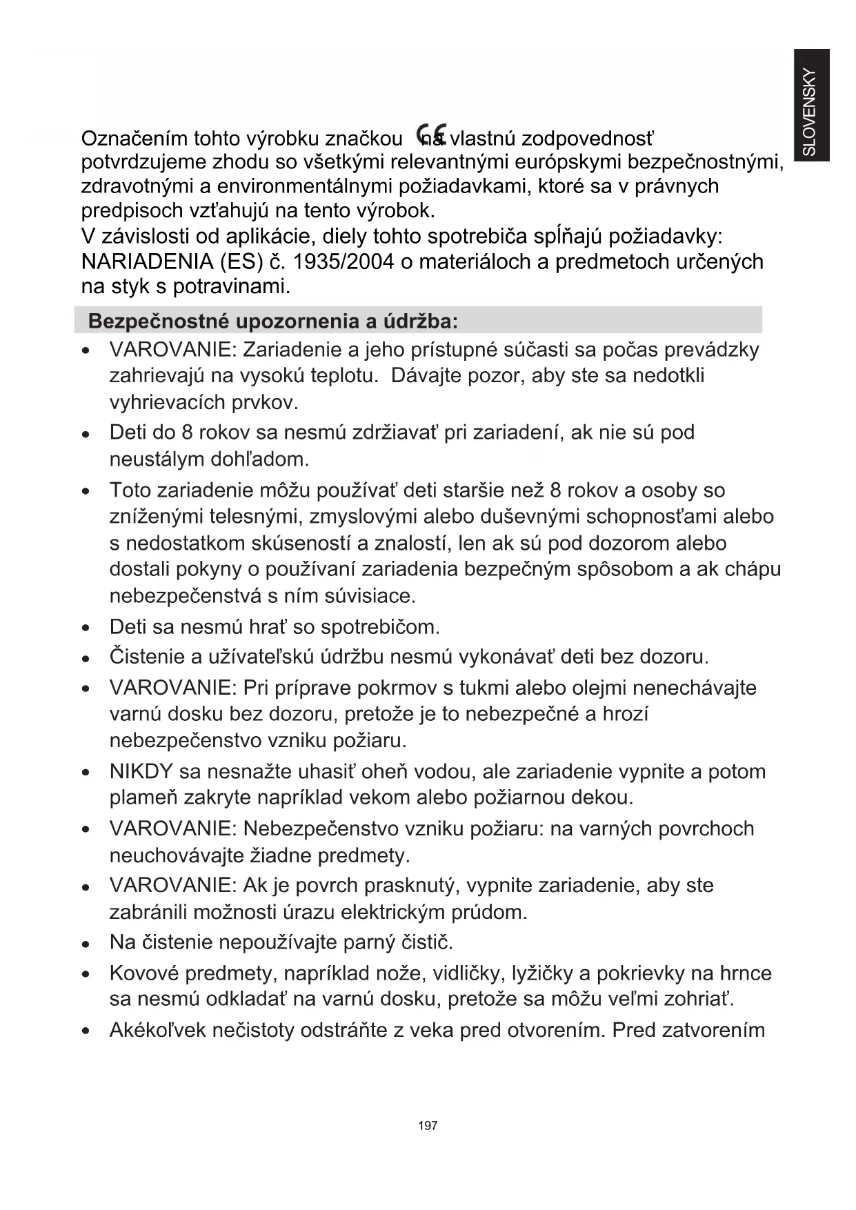 SLOVENSKY Označením tohto výrobku značkou na vlastnú zodpovednosť potvrdzujeme zhodu so všetkými relevantnými európskymi bezpečnostnými, zdravotnými a environmentálnymi požiadavkami, ktoré sa v právnych predpisoch vzťahujú na tento výrobok. V závislosti od aplikácie, diely tohto spotrebiča spĺňajú požiadavky: NARIADENIA (ES) č. 1935/2004 o materiáloch a predmetoch určených na styk s potravinami. Bezpečnostné upozornenia a údržba: