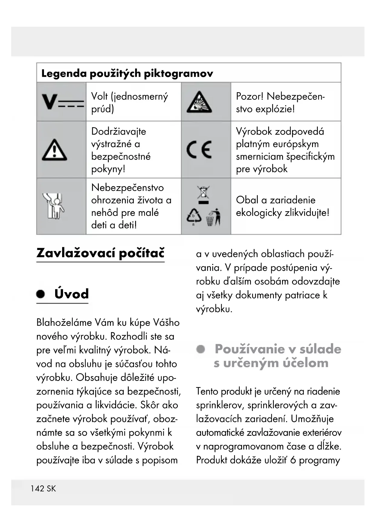 Tlačidlo - zmeniť zavlažovací režim Tlačidlo - Za- / vypnúť výrobok (ON/OFF) Slabá batériaSK 145 Bezpečnosť Bezpečnostné upozornenia V prípade škôd, ktoré vzniknú nedodržiavaním tohto návodu na ob- sluhu, zaniká garančný nárok! Pri následných škodách nepreberá vý-