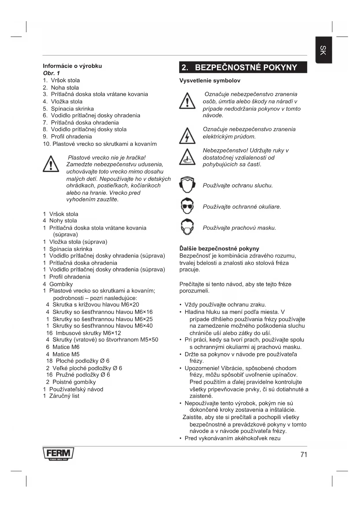 Plastovévreckoniejehračka! Zamedztenebezpečenstvuudusenia, uchovávajte toto vrecko mimo dosahu malýchdetí.Nepoužívajtehovdetských ohrádkach,postieľkach,kočiarikoch alebo na hranie. Vrecko pred vyhodením zauzlite. 1 Vršok stola 4 Nohy stola 1 Prítlačná doska stola vrátane kovania (súprava) 1 Vložka stola (súprava) 1 Spínacia skrinka 1 Vodidlo prítlačnej dosky ohradenia (súprava) 1 Prítlačná doska ohradenia 1 Vodidlo prítlačnej dosky ohradenia (súprava) 1 Profil ohradenia 4 Gombíky 1 Plastové vrecko so skrutkami a kovaním; podrobnosti – pozri nasledujúce: 4 Skrutka s krížovou hlavou M6×20 4 Skrutky so šesťhrannou hlavou M6×16 1 Skrutky so šesťhrannou hlavou M6×25 1 Skrutky so šesťhrannou hlavou M6×40 16 Imbusové skrutky M6×12 4 Skrutky (vratové) so štvorhranom M5×50 6 Matice M6 4 Matice M5 18 Ploché podložky Ø 6 2 Veľké ploché podložky Ø 6 16 Pružné podložky Ø 6 2 Poistné gombíky 1 Používateľský návod 1 Záručný list