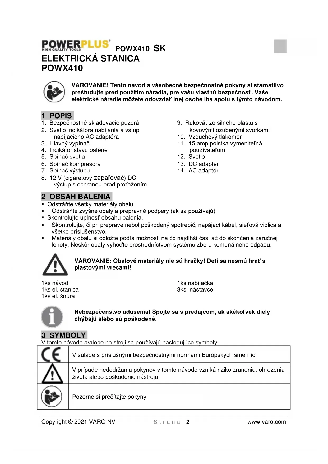 Copyright © 2021 VARO NV S t r a n a | 2 www.varo.com ELEKTRICKÁ STANICA POWX410 VAROVANIE! Tento návod a všeobecné bezpečnostné pokyny si starostlivo preštudujte pred použitím náradia, pre vašu vlastnú bezpečnosť. Vaše elektrické náradie môžete odovzdať inej osobe iba spolu s týmto návodom. 1 POPIS