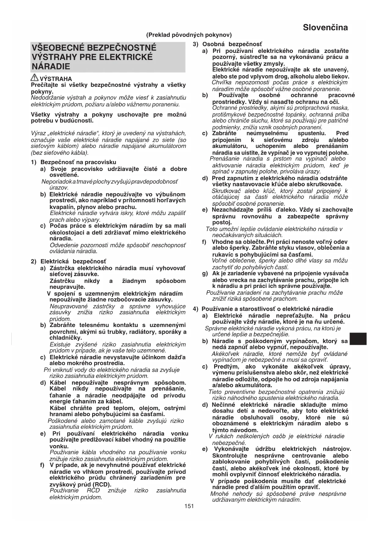 NÁRADIE VÝSTRAHA Prečítajte si všetky bezpečnostné výstrahy a všetky pokyny. Nedodržanie výstrah a pokynov môže viesť k zasiahnutiu elektrickým prúdom, požiaru a/alebo vážnemu poraneniu. Všetky výstrahy a pokyny uschovajte pre možnú potrebu v budúcnosti. Výraz „elektrické náradie“, ktorý je uvedený na výstrahách, označuje vaše elektrické náradie napájané zo siete (so sieťovým káblom) alebo náradie napájané akumulátorom (bez sieťového kábla).