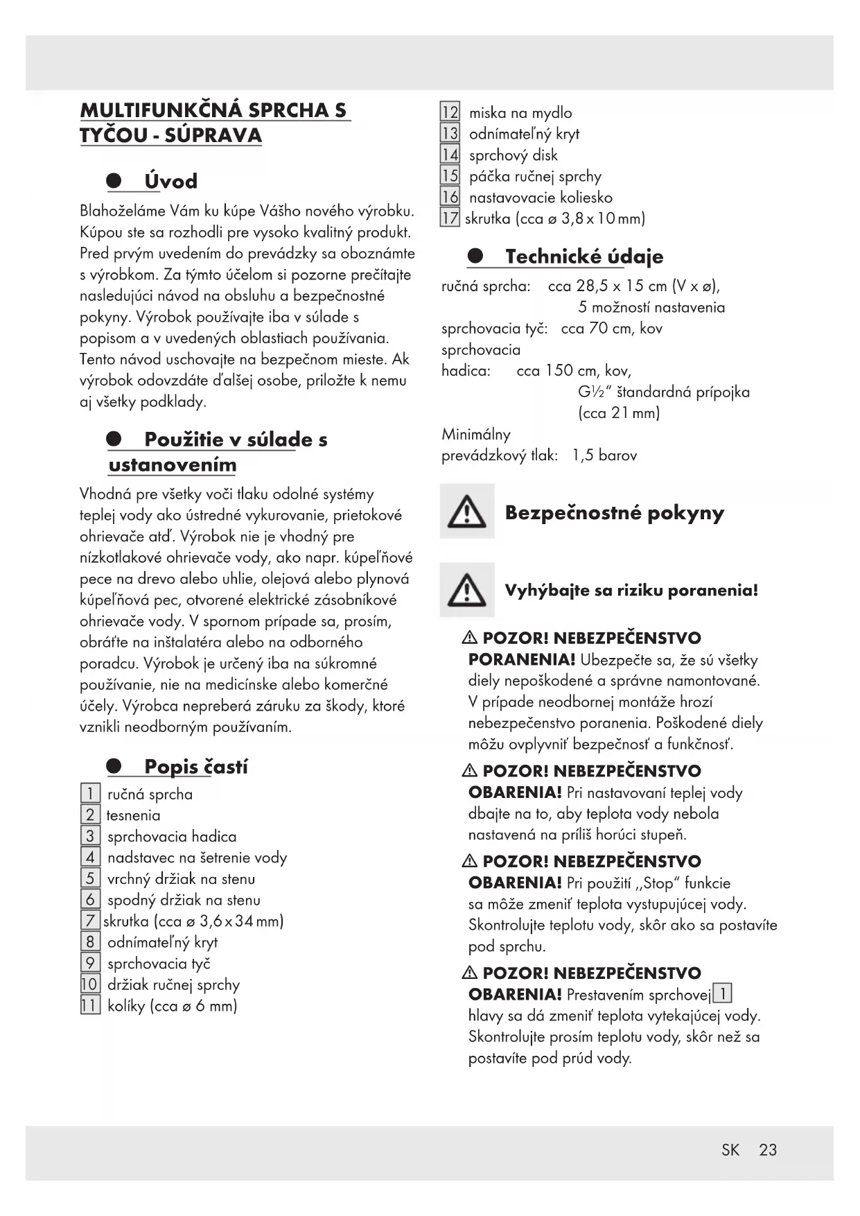 skrutka (cca ø 3,8 x 10 mm) Technické údaje ručná sprcha: cca 28,5 x 15 cm (V x ø), 5 možností nastavenia sprchovacia tyč: cca 70 cm, kov sprchovacia hadica: cca 150 cm, kov, G½“ štandardná prípojka (cca 21 mm) Minimálny prevádzkový tlak: 1,5 barov Bezpečnostné pokyny Vyhýbajte sa riziku poranenia! m POZOR! NEBEZPEČENSTVO PORANENIA! Ubezpečte sa, že sú všetky diely nepoškodené a správne namontované. V prípade neodbornej montáže hrozí nebezpečenstvo poranenia. Poškodené diely môžu ovplyvniť bezpečnosť a funkčnosť. m POZOR! NEBEZPEČENSTVO OBARENIA! Pri nastavovaní teplej vody dbajte na to, aby teplota vody nebola nastavená na príliš horúci stupeň. m POZOR! NEBEZPEČENSTVO OBARENIA! Pri použití ,,Stop“ funkcie sa môže zmeniť teplota vystupujúcej vody. Skontrolujte teplotu vody, skôr ako sa postavíte pod sprchu. m POZOR! NEBEZPEČENSTVO OBARENIA! Prestavením sprchovej