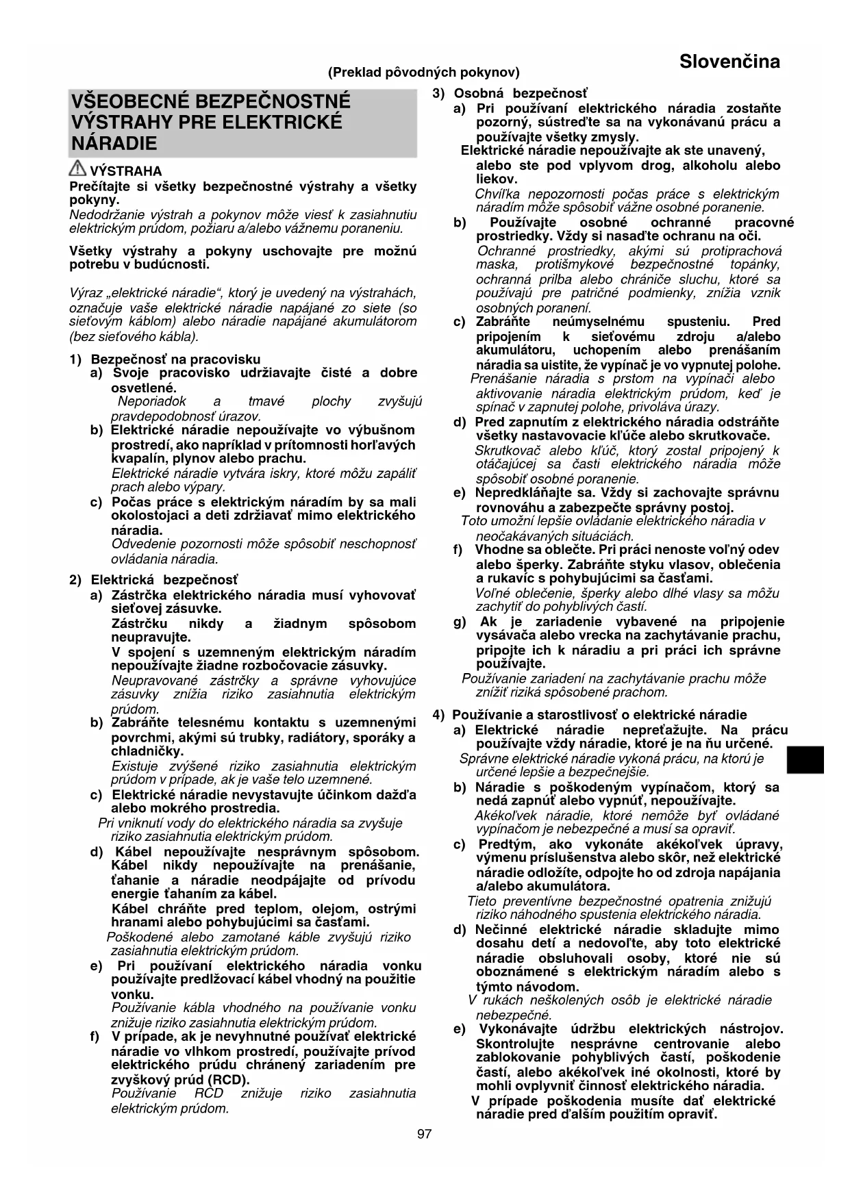NÁRADIE VÝSTRAHA Prečítajte si všetky bezpečnostné výstrahy a všetky pokyny. Nedodržanie výstrah a pokynov môže viesť k zasiahnutiu elektrickým prúdom, požiaru a/alebo vážnemu poraneniu. Všetky výstrahy a pokyny uschovajte pre možnú potrebu v budúcnosti. Výraz „elektrické náradie“, ktorý je uvedený na výstrahách, označuje vaše elektrické náradie napájané zo siete (so sieťovým káblom) alebo náradie napájané akumulátorom (bez sieťového kábla).
