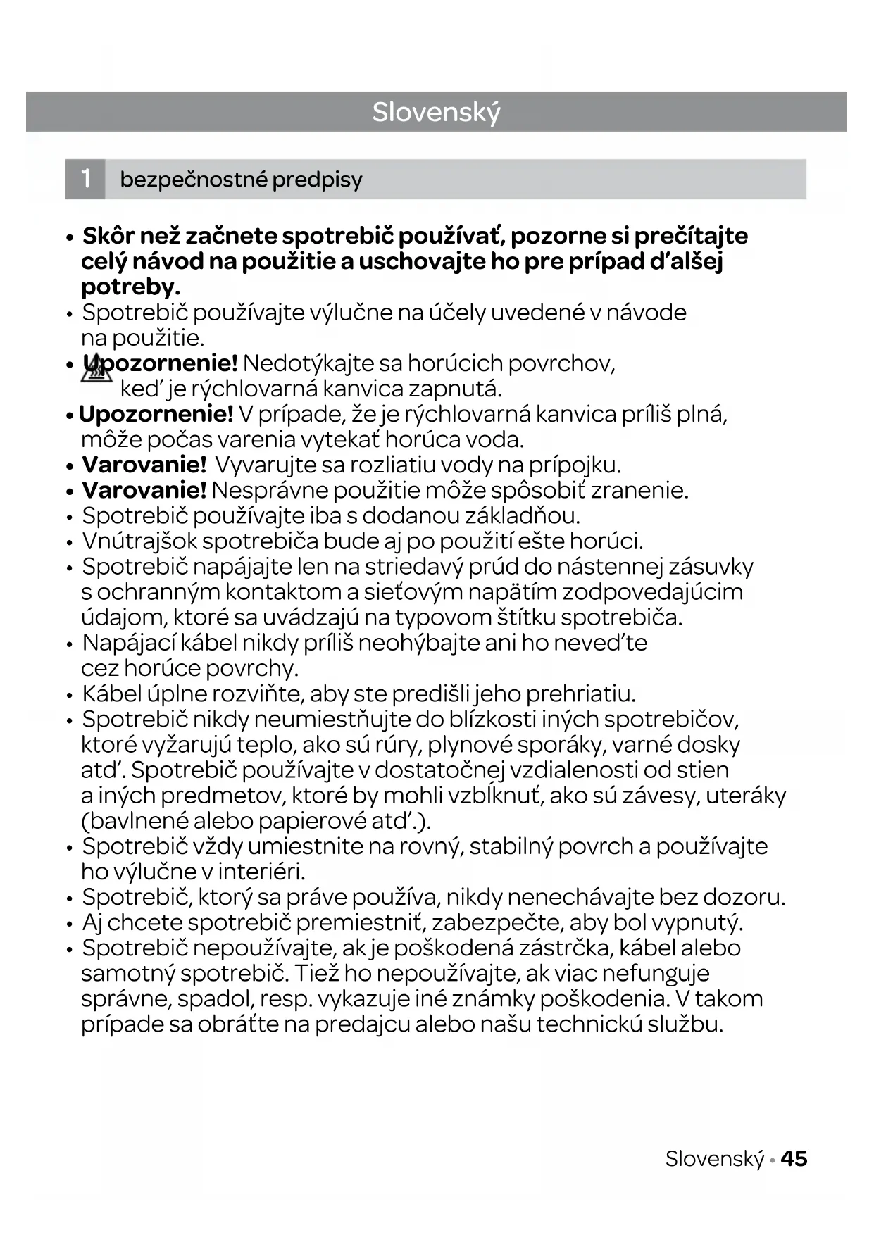 - Spotrebič nepoužívajte, ak je poškodená zástrčka, kábel alebo samotný spotrebič. Tiež ho nepoužívajte, ak viac nefunguje správne, spadol, resp. vykazuje iné známky poškodenia. V takom prípade sa obráťte na predajcu alebo našu technickú službu. Slovenský bezpečnostné predpisy