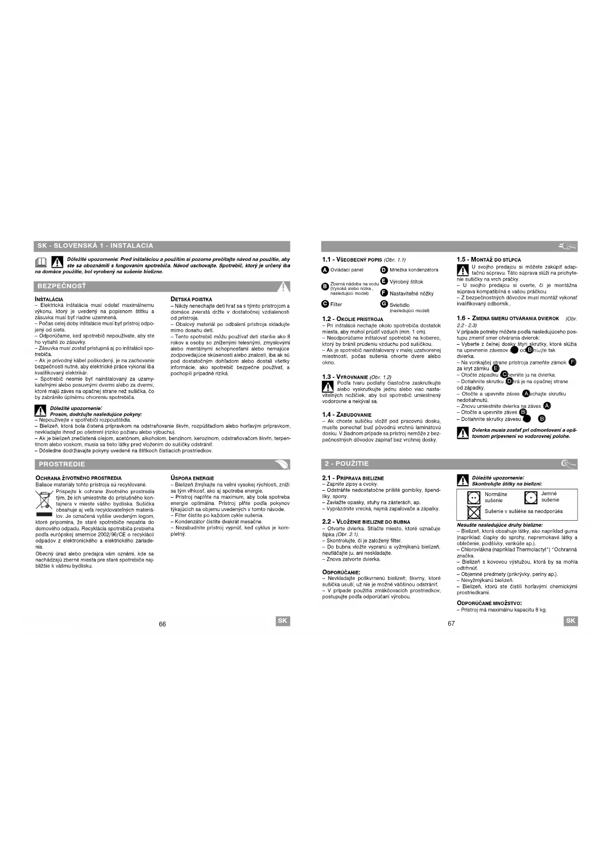 Pred inštaláciou a použitím si pozorne prečítajte návod na použitie, aby ste sa oboznámili s fungovaním spotrebiča. Návod uschovajte. Spotrebič, ktorý je určený iba na domáce použitie, bol vyrobený na sušenie bielizne. BEZPEČNOSŤ