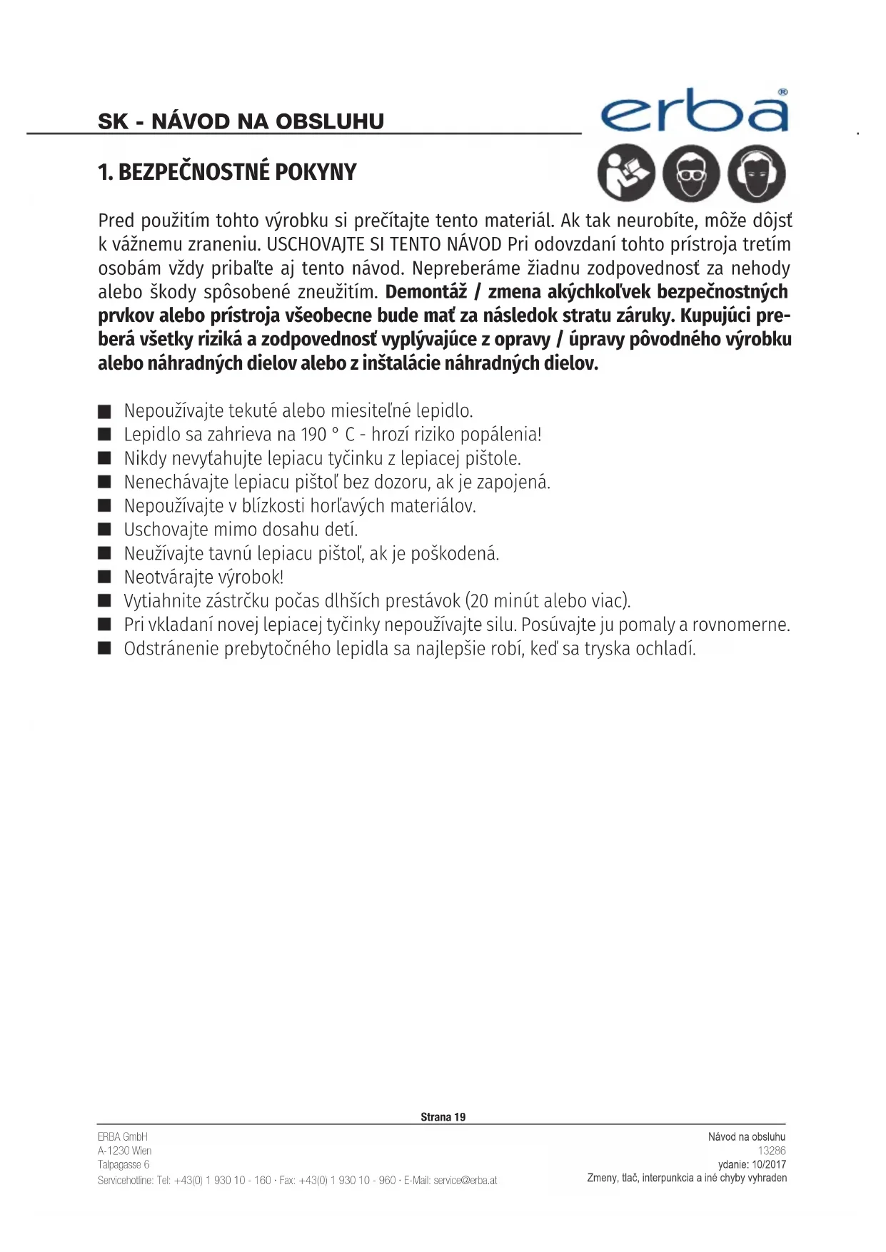 Nepoužívajte tekuté alebo miesiteľné lepidlo. Lepidlo sa zahrieva na 190 ° C - hrozí riziko popálenia! Nikdy nevyťahujte lepiacu tyčinku z lepiacej pištole. Nenechávajte lepiacu pištoľ bez dozoru, ak je zapojená. Nepoužívajte v blízkosti horľavých materiálov. Uschovajte mimo dosahu detí. Neužívajte tavnú lepiacu pištoľ, ak je poškodená. Neotvárajte výrobok! Vytiahnite zástrčku počas dlhších prestávok (20 minút alebo viac). Pri vkladaní novej lepiacej tyčinky nepoužívajte silu. Posúvajte ju pomaly a rovnomerne. Odstránenie prebytočného lepidla sa najlepšie robí, keď sa tryska ochladí.ERBA GmbH A-1230 Wien Talpagasse 6 Servicehotline: Tel: +43(0) 1 930 10 - 160 · Fax: +43(0) 1 930 10 - 960 · E-Mail: service@erba.at Návod na obsluhu