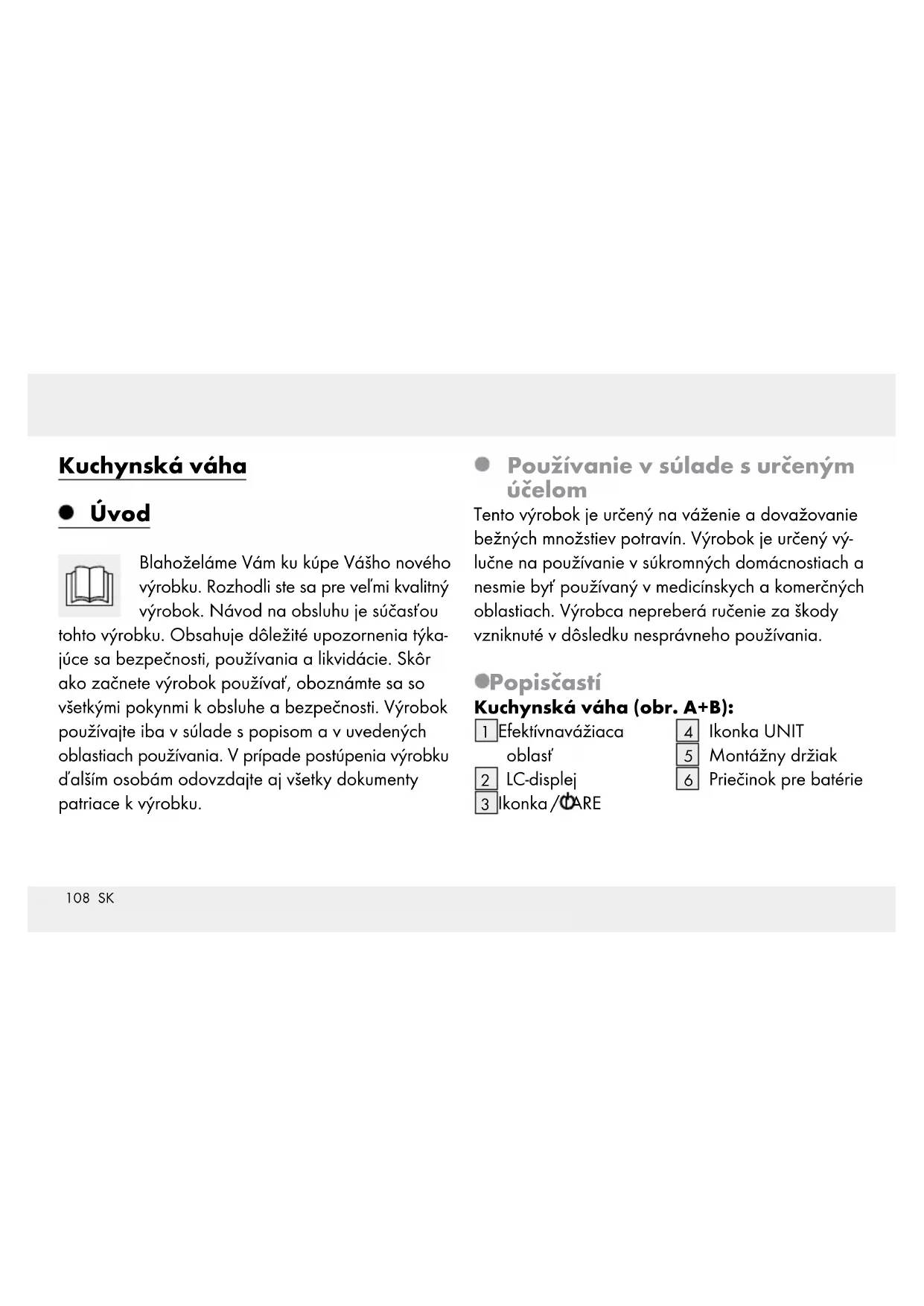PRE MALÉ I STARŠIE DETI! Nikdy nenechávajte deti bez dozoru s obalovým materiálom. Existuje nebezpečenstvo zaduse- nia obalovým materiálom. Deti často podceňujú nebezpečenstvo. Obalový materiál držte vždy mimo dosahu detí. Tento výrobok môžu používať deti od 8 rokov, ako aj osoby so zní- ženými psychickými, senzorickými alebo duševnými schopnosťami111 SK alebo s nedostatkom skúseností a vedomostí, ak sú pod dozorom, alebo ak boli poučené ohľadom bezpečného používania výrobku, a ak porozumeli nebezpečenstvám spojeným s jeho používaním. Deti sa s výrobkom nesmú hrať. Čiste- nie a údržbu nesmú vykonávať deti bez dozoru. 5 kg POZOR! NEBEZPE- ČENSTVO PORANE- NIA! Nepreťažujte produkt nad 5 kg. Produkt by sa mohol poškodiť. Nevystavujte produkt – extrémnym teplotám – priamemu slnečnému žiareniu – magnetickému okoliu – vlhkosti. V opačnom prípade hrozí poškodenie produktu. Výrobok obsahuje citlivé elektro- nické súčiastky. Preto je možné,112 SK že ho rádiové prenosové zaria- denia v bezprostrednej blízkosti budú rušiť. Môžu to byť napr. mobilné telefóny, rádiotelefónne zariadenia, CB rádiové zariade- nia, diaľkové riadenia alebo iné diaľkové ovládania a mikrovlnné prístroje. Ak sa na displeji vyskytne chybné zobrazenie, odstráňte takéto prístroje z okolia výrobku. Elektromagnetické rušenia / vyso- kofrekvenčné rušivé vyžarovania môžu viesť k funkčným poruchám. Pri takýchto funkčných poruchách vyberte na krátky čas batériu a znova ju vložte. Postupujte pritom podľa kapitoly „Výmena batérie”. Chráňte produkt pred elektrosta- tickým nábojom / vybitím. Toto by mohlo obmedziť internú výmenu údajov, čo spôsobuje chyby na LC-displeji