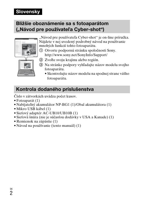 Slovensky Bližšie oboznámenie sa s fotoaparátom („Návod pre používateľa Cyber-shot“) „Návod pre používateľa Cyber-shot“ je on-line príručka. Nájdete v nej uvedený podrobný návod na používanie mnohých funkcií tohto fotoaparátu. 1 Otvorte podpornú stránku spoločnosti Sony. http://www.sony.net/SonyInfo/Support/ 2 Zvoľte svoju krajinu alebo región. 3 Na stránke podpory vyhľadajte názov modelu svojho fotoaparátu.