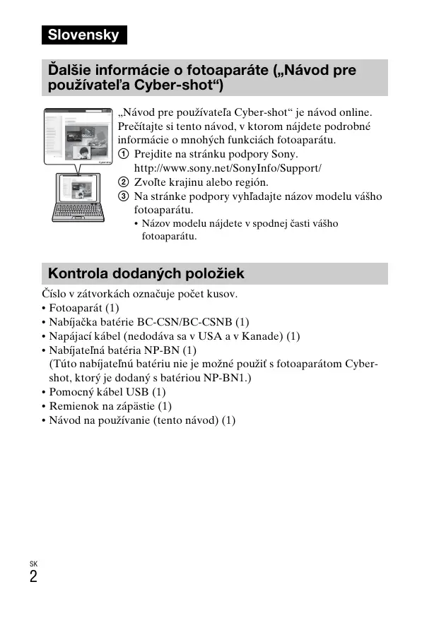 Slovensky Ďalšie informácie o fotoaparáte („Návod pre používateľa Cyber-shot“) „Návod pre používateľa Cyber-shot“ je návod online. Prečítajte si tento návod, v ktorom nájdete podrobné informácie o mnohých funkciách fotoaparátu. 1 Prejdite na stránku podpory Sony. http://www.sony.net/SonyInfo/Support/ 2 Zvoľte krajinu alebo región. 3 Na stránke podpory vyhľadajte názov modelu vášho fotoaparátu.