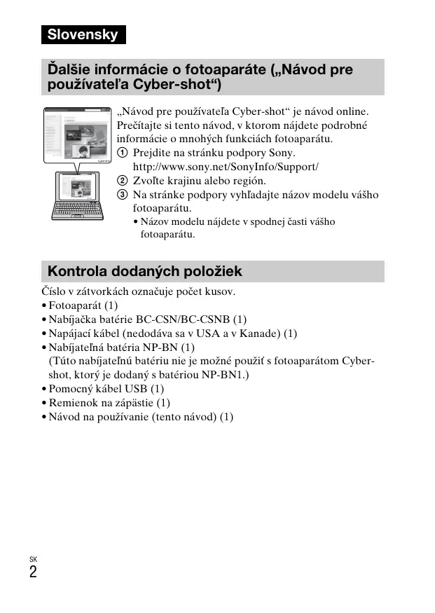 Slovensky Ďalšie informácie o fotoaparáte („Návod pre používateľa Cyber-shot“) „Návod pre používateľa Cyber-shot“ je návod online. Prečítajte si tento návod, v ktorom nájdete podrobné informácie o mnohých funkciách fotoaparátu. 1 Prejdite na stránku podpory Sony. http://www.sony.net/SonyInfo/Support/ 2 Zvoľte krajinu alebo región. 3 Na stránke podpory vyhľadajte názov modelu vášho fotoaparátu.