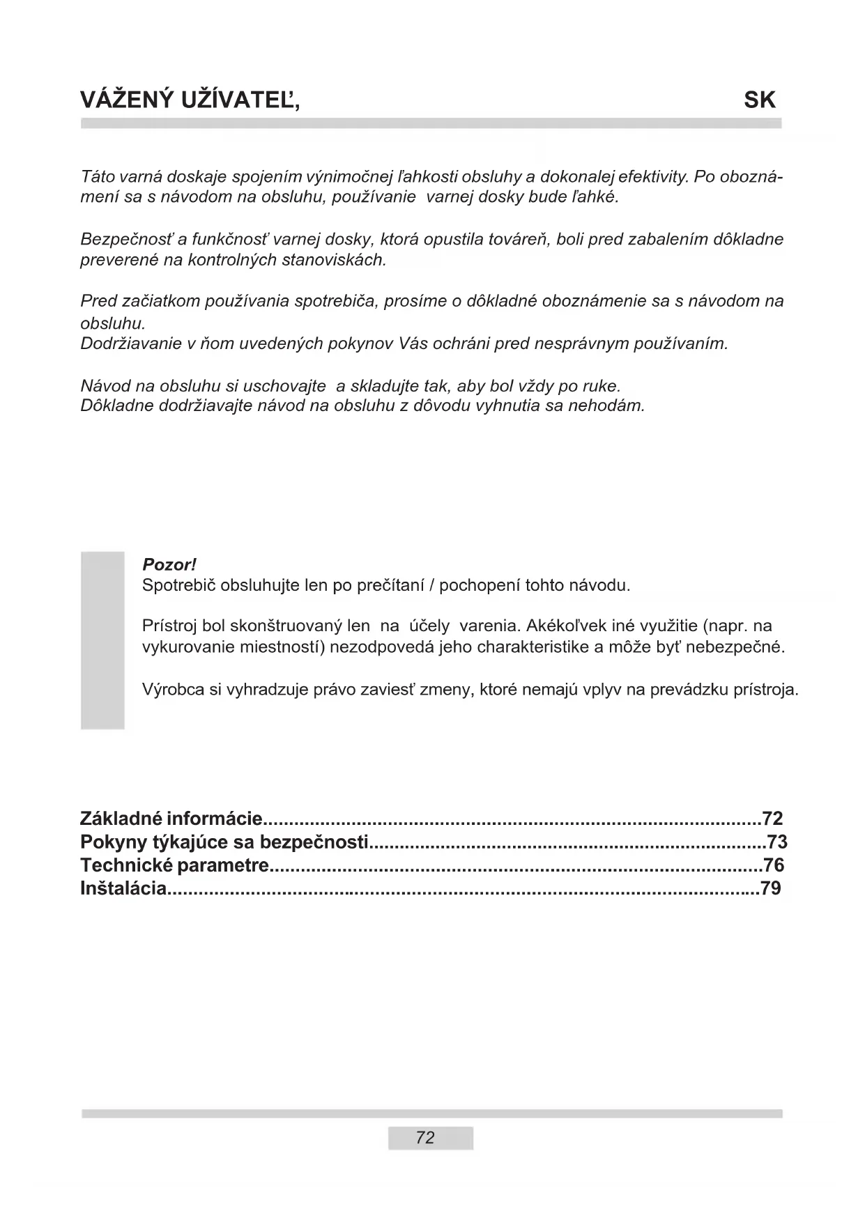 - Pozor! Spotrebič obsluhujte len po prečítaní / pochopení tohto návodu. Prístroj bol skonštruovaný len na účely varenia. Akékoľvek iné využitie (napr. na vykurovanie miestností) nezodpovedá jeho charakteristike a môže byť nebezpečné. Výrobca si vyhradzuje právo zaviesť zmeny, ktoré nemajú vplyv na prevádzku prístroja. Táto varná doskaje spojením výnimočnej ľahkosti obsluhy a dokonalej efektivity. Po obozná- mení sa s návodom na obsluhu, používanie varnej dosky bude ľahké. Bezpečnosť a funkčnosť varnej dosky, ktorá opustila továreň, boli pred zabalením dôkladne preverené na kontrolných stanoviskách. Pred začiatkom používania spotrebiča, prosíme o dôkladné oboznámenie sa s návodom na obsluhu. Dodržiavanie v ňom uvedených pokynov Vás ochráni pred nesprávnym používaním. Návod na obsluhu si uschovajte a skladujte tak, aby bol vždy po ruke. Dôkladne dodržiavajte návod na obsluhu z dôvodu vyhnutia sa nehodám. VÁŽENÝ UŽÍVATEĽ, Základné informácie p. 72