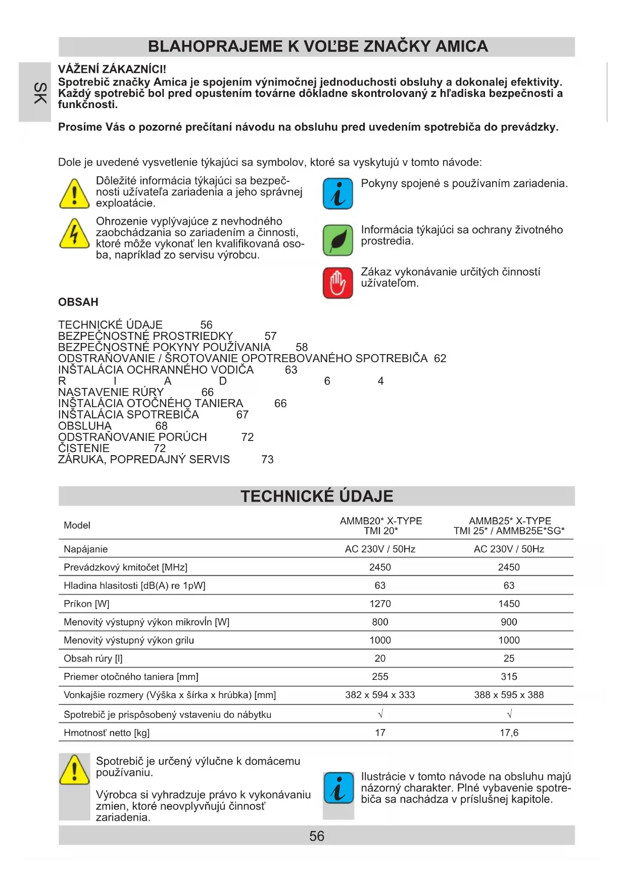ModelAMMB20* X-TYPETMI 20*AMMB25* X-TYPETMI 25* / AMMB25E*SG*Napájanie AC 230V / 50Hz AC 230V / 50HzPrevádzkový kmitočet [MHz] 2450 2450Hladina hlasitosti [dB(A) re 1pW] 63 63Príkon [W] 1270 1450 Menovitý výstupný výkon mikrovĺn [W] 800 900 Menovitý výstupný výkon grilu 1000 1000Obsah rúry [l] 20 25Priemer otočného taniera [mm] 255 315 Vonkajšie rozmery (Výška x šírka x hrúbka) [mm] 382 x 594 x 333 388 x 595 x 388 Spotrebič je prispôsobený vstaveniu do nábytku √ √Hmotnosť netto [kg] 17 17,657
