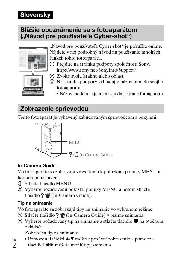 Slovensky Bližšie oboznámenie sa s fotoaparátom („Návod pre používateľa Cyber-shot“) „Návod pre používateľa Cyber-shot“ je príručka online. Nájdete v nej podrobný návod na používanie mnohých funkcií tohto fotoaparátu. 1 Prejdite na stránku podpory spoločnosti Sony. http://www.sony.net/SonyInfo/Support/ 2 Zvoľte svoju krajinu alebo oblasť. 3 Na stránke podpory vyhľadajte názov modelu svojho fotoaparátu.