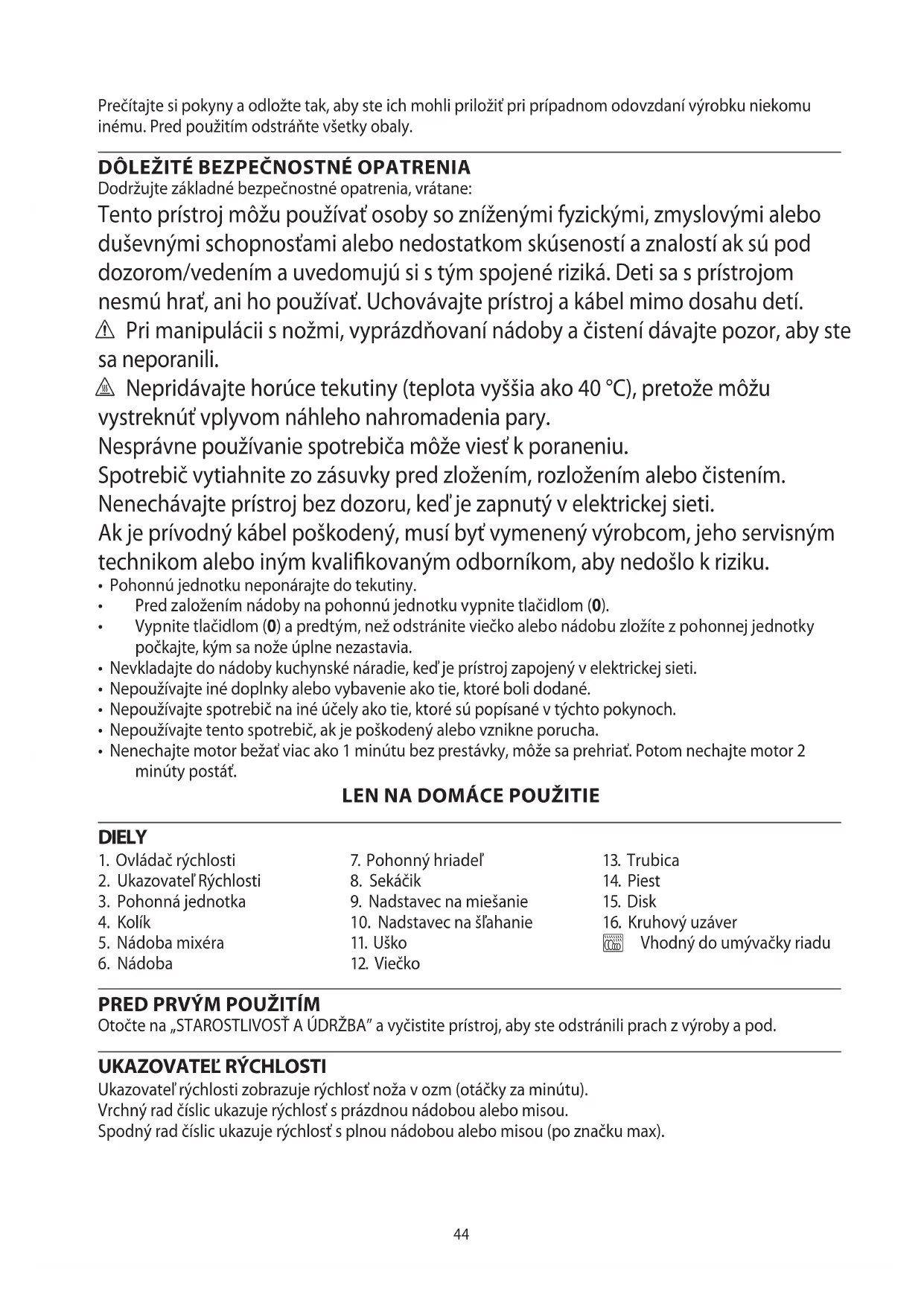 Dodržujte základné bezpečnostné opatrenia, vrátane: Tento prístroj môžu používať osoby so zníženými fyzickými, zmyslovými alebo duševnými schopnosťami alebo nedostatkom skúseností a znalostí ak sú pod dozorom/vedením a uvedomujú si s tým spojené riziká. Deti sa s prístrojom nesmú hrať, ani ho používať. Uchovávajte prístroj a kábel mimo dosahu detí. c Pri manipulácii s nožmi, vyprázdňovaní nádoby a čistení dávajte pozor, aby ste sa neporanili. h Nepridávajte horúce tekutiny (teplota vyššia ako 40 °C), pretože môžu vystreknúť vplyvom náhleho nahromadenia pary. Nesprávne používanie spotrebiča môže viesť k poraneniu. Spotrebič vytiahnite zo zásuvky pred zložením, rozložením alebo čistením. Nenechávajte prístroj bez dozoru, keď je zapnutý v elektrickej sieti. Ak je prívodný kábel poškodený, musí byť vymenený výrobcom, jeho servisným technikom alebo iným kvalikovaným odborníkom, aby nedošlo k riziku.
