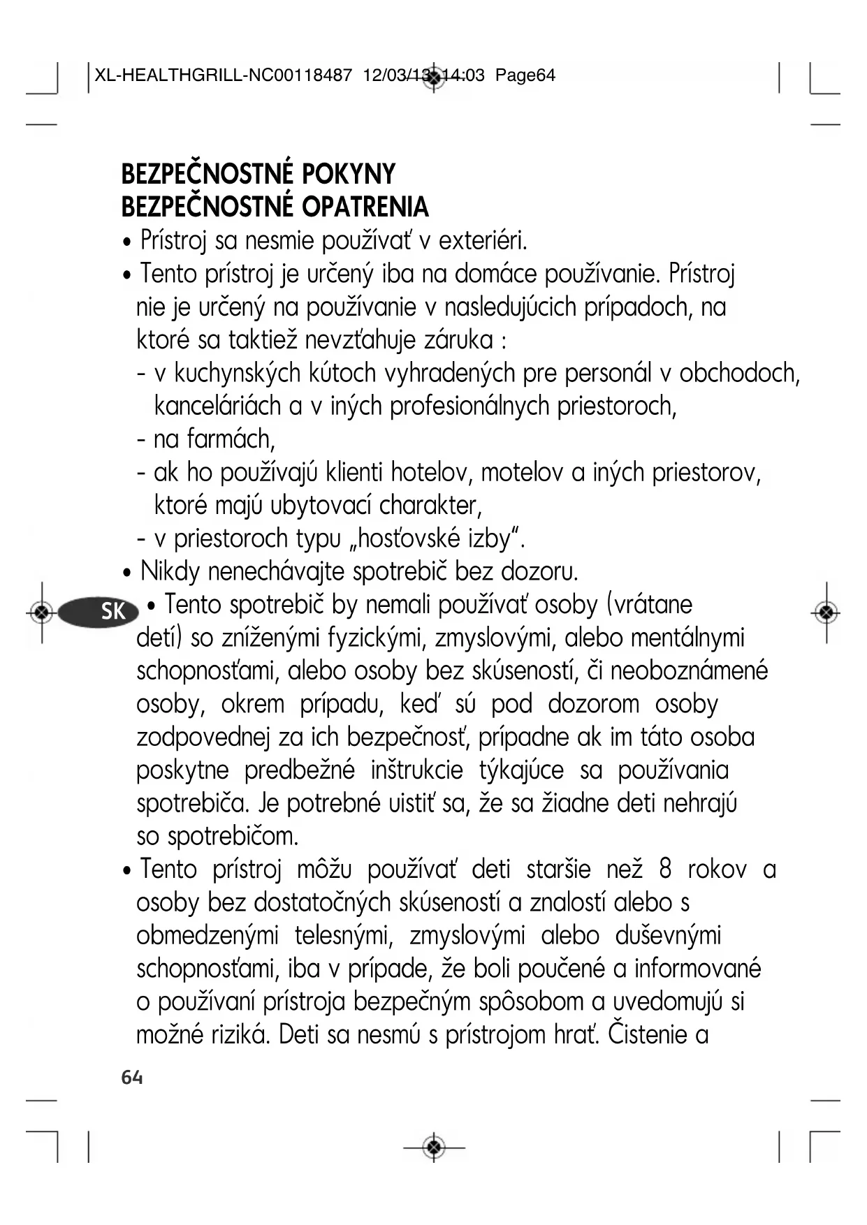 XL-HEALTHGRILL-NC00118487 12/03/13 14:03 Page64užívateľskú údržbu nesmú vykonávať deti do 8 rokov, staršie deti len pod dozorom. Udržujte prístroj a prívodný kábel mimo dosahu detí do 8 rokov.