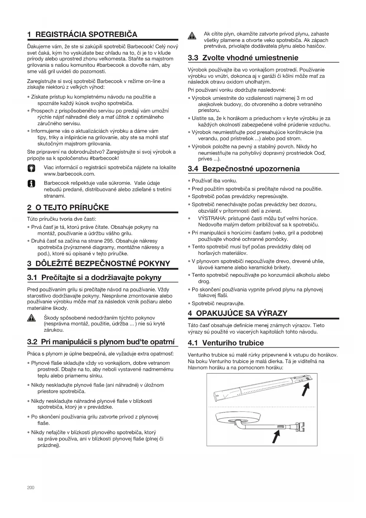 - Plyn môže tiež začaf horief mimo Venturiho trubice, pri otočných ovládačoch. Tento druh plameňa sa nazývať spätný ráz a môže mať za následok vážne zranenie alebo škody na majetku. Škody spôsobené upchatými horákmi a Venturiho trubicami sa považujú za nesprávnu údržbu a nie sú kryté zárukou.