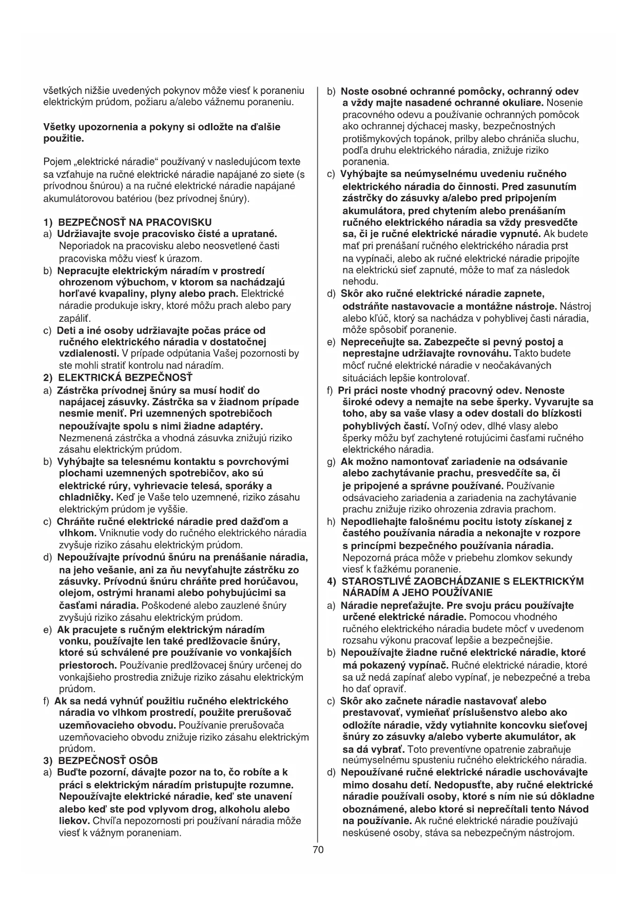 a) Buďte pozorní, dávajte pozor na to, čo robíte a k práci s elektrickým náradím pristupujte rozumne. Nepoužívajte elektrické náradie, keď ste unavení alebo keď ste pod vplyvom drog, alkoholu alebo liekov. Chvíľa nepozornosti pri používaní náradia môže viesť k vážnym poraneniam.71