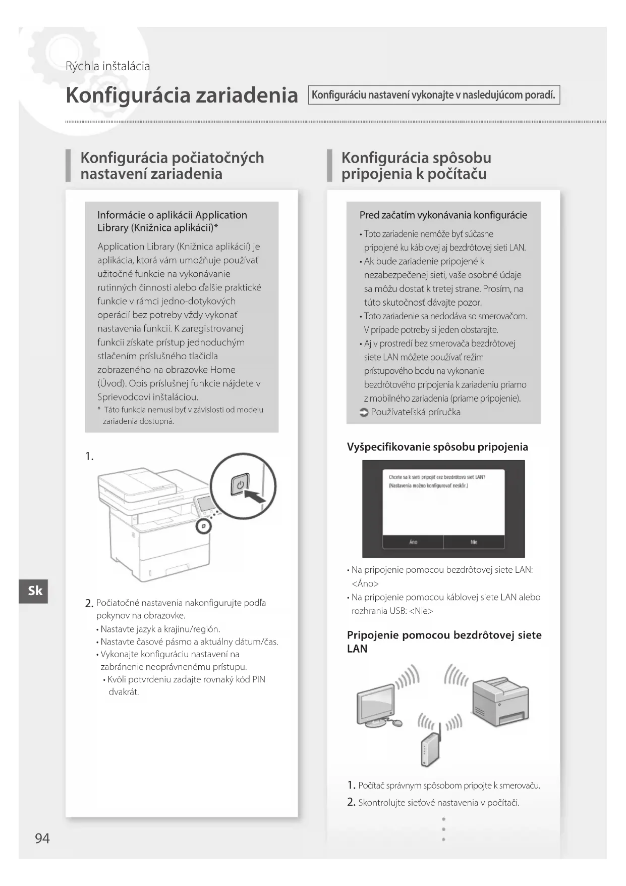 Konfigurace nastavení faxu Rychlé nastavení CsKonfigurácia spôsobu pripojenia kpočítaču Informácie oaplikácii Application Library (Knižnica aplikácií)*Application Library (Knižnica aplikácií) je aplikácia, ktorá vám umožňuje používať užitočné funkcie na vykonávanie rutinných činností alebo ďalšie praktické funkcie v rámci jedno-dotykových operácií bez potreby vždy vykonať nastavenia funkcií. K zaregistrovanej funkcii získate prístup jednoduchým stlačením príslušného tlačidla zobrazeného na obrazovke Home (Úvod). Opis príslušnej funkcie nájdete v Sprievodcovi inštaláciou.* Táto funkcia nemusí byť vzávislosti od modelu zariadenia dostupná.
