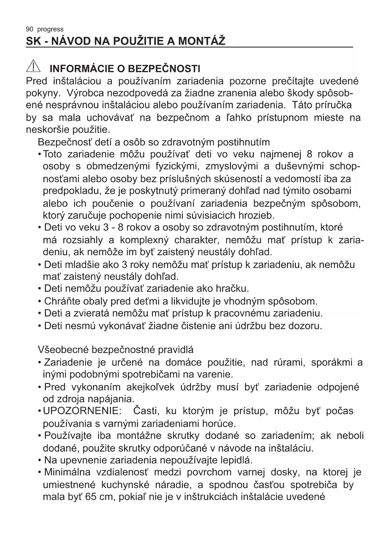 - Minimálna vzdialenosť medzi povrchom varnej dosky, na ktorej je umiestnené kuchynské náradie, a spodnou časťou spotrebiča by mala byť 65 cm, pokiaľ nie je v inštrukciách inštalácie uvedenéprogress 91 inak. Ak je v pokynoch na inštaláciu varnej dosky určená väčšia vzdialenosť, malo by sa toto zohľadniť.