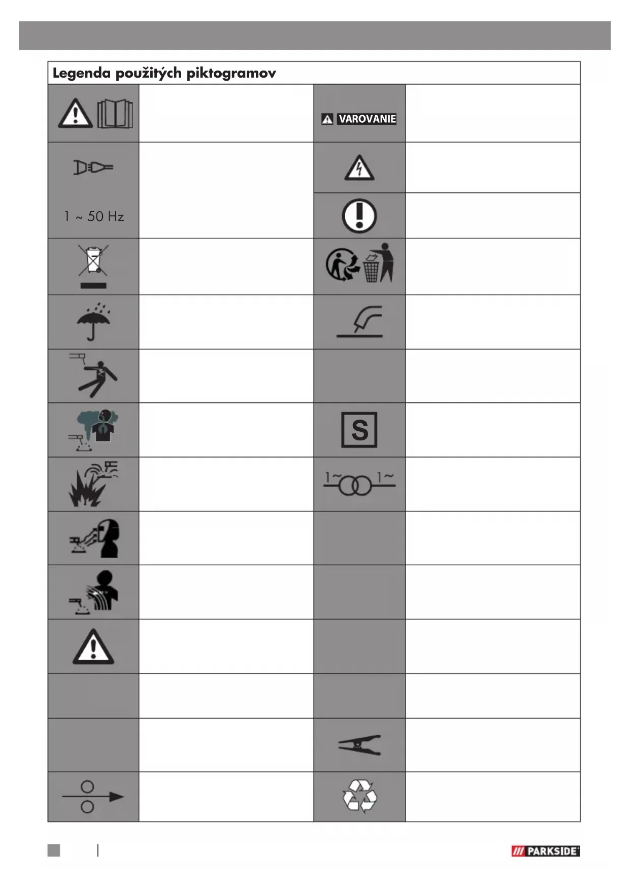 Legenda použitých piktogramov Legenda použitých piktogramov Opatrnosť! Prečítajte si návod na obsluhu! VAROVANIE Riziko vážnych až smrteľných zranení! Vstup siete; Počet fáz a tiež Opatrnosť! Nebezpečenstvo zásahu elek- trickým prúdom! 1 ~ 50Hz symbol striedavého prúdu a menovitá hodnota frekvencie. Dôležité upozornenie! Elektrické prístroje nelikvidujte v domovom odpade! Obal a prístroj zlikvidujte ekologicky! Nepoužívajte prístroj navoľ- nom priestranstve apočas dažďa! Zváranie samoochranným plným drôtom. Zásah elektrickým prúdom zváracej elektródy môže byť smrteľný! IP21SDruh krytia. Nadýchanie sa splodín zvá- racieho procesu môže ohroziť vaše zdravie.