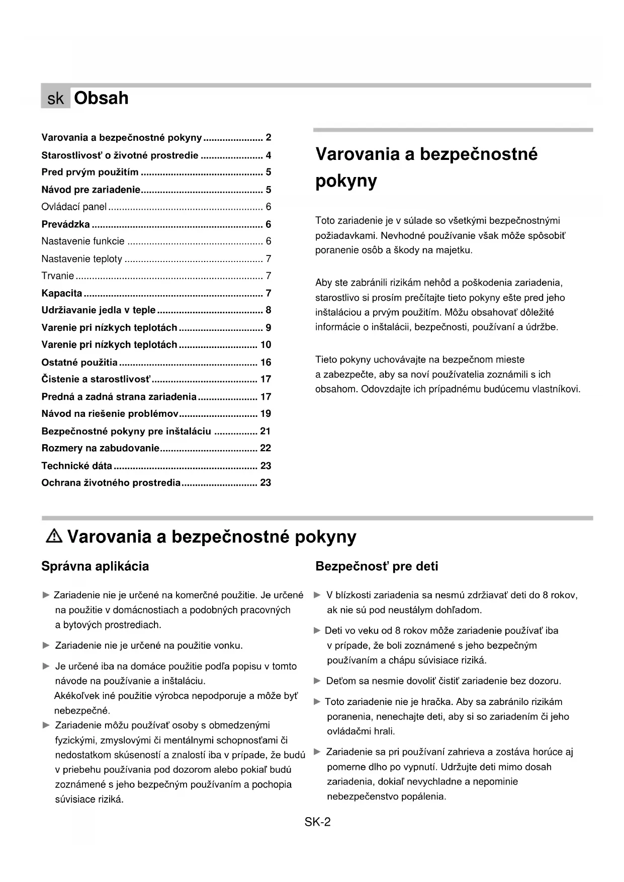(pozrite tabuľku).SK-10 Varenie pri nízkych teplotách