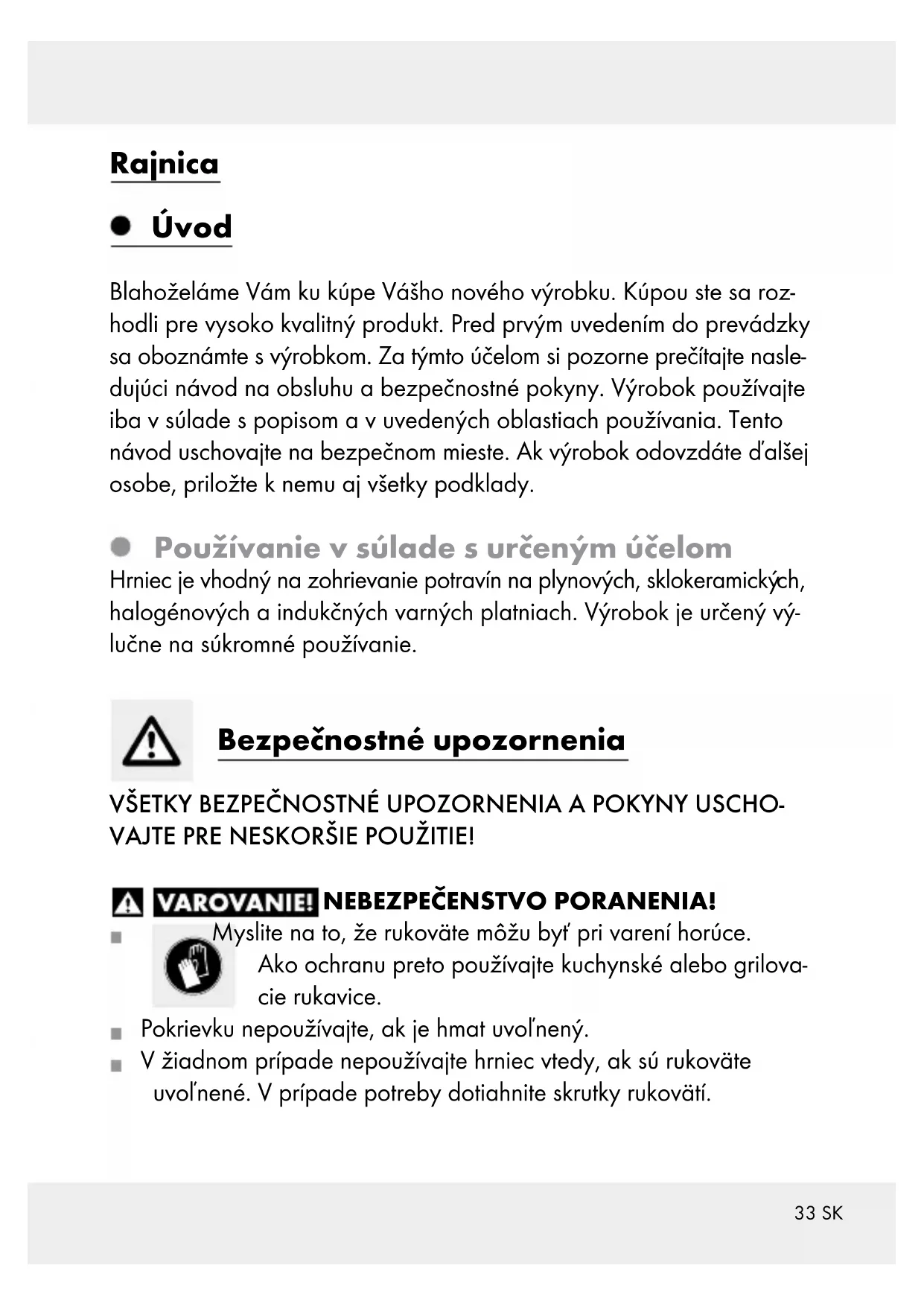 MATERIÁLU! Pri varení je veľmi dôležité mať stále pod kontrolou hrnce a panvice, v ktorých sa zohrieva tuk. Tuk sa môže veľmi rýchlo zohriať a zapá- liť. Ak by došlo k vznieteniu tuku, nikdy ho nehaste vodou! Plamene uhaste pomocou pokrievky alebo hrubou vlnenou prikrývkou. Aby sa nepoškodila antiadhézna vrstva, používajte iba kuchynské pomôcky z teplovzdorného plastu alebo dreva. Nekrájajte potra- viny, ktoré chcete dusiť, priamo v hrnci. Do horúceho tuku neklaďte mäso, z ktorého kvapká voda. Tuk vystrekujúci na rozžeravenú platňu sporáka môže ľahko spôsobiť vznik požiaru. Šetrite energiou! Vyberte varnú platňu, ktorá zodpovedá prie- meru dna hrnca, aby ste tak zabránili stratám tepla. Účinný priemer dna: cca. 12 cm. Výrobok je bez pokrievky vhodný na udržiavanie teplých jedál v rúre (max. 160 °C na 1 hodinu). Vysoké teploty môžu viesť k zafarbeniam na vonkajšej strane pro- duktu. Toto nie je chyba materiálu a neovplyvňuje to kvalitu a funkciu výrobku. Horúci produkt nikdy nedržte pod tečúcou studenou vodou. Spodná strana produktu by sa pritom mohla poškodiť alebo odpadnúť z produktu. Výrobok je vhodný na umývanie v umývačke riadu. Časté čistenie ostrými čistiacimi prostriedkami môže viesť k poško- deniu a / alebo zafarbeniu hrnca. Umývaním v umývačke riadu sa môže zmeniť farebný odtieň hliníkových častí. POZOR! Sklenená pokrievka je rozbitná / nie je odolná voči nárazom!35 SK Pri ručnom umývaní očistite hrniec horúcou vodou a bežným umý- vacím prostriedkom. Nepoužívajte pritom ostré a špicaté predmety, aby ste nepoškodili materiál. Výrobok neťahajte ani neposúvajte po sklokeramických a halogé- nových varných doskách. Pri nedodržiavaní môže dôjsť k poško- deniu skrze poškrabania. Upozornenie pre indukčné varné platne Upozornenie: Za určitých okolností sa môže vyskytnúť zvuk, ktorého príčinou sú elektromagnetické vlastnosti tepelného zdroja hrnca / panvice. Je to normálne a nepoukazuje to na defekt Vašej indukčnej varnej platne alebo kuchynského riadu. Hrniec / panvicu umiestnite stredovo na indukčnej platni. POZOR! Vysoká rýchlosť stúpania teploty pri ohreve! Riad pri predhrievaní neprehrejte. V prípade prehriatia je potrebné dôkladne vyvetrať miestnosť. Používanie Pred prvým použitím odstráňte prípadné nálepky z výrobku a opláchnite ho horúcou vodou. Hrniec pred prvým použitím vyvarte 2 až 3 krát vodou, aby sa úplne odstránili prípadné zvyšky z výroby. Prázdnu alebo jedlom určeným na pečenie naplnenú panvicu ne- prehrejte, pretože inak slabne antiadhézny efekt, resp. dochádza k poškodeniu antiadhéznej vrstvy.36 SK Likvidácia Obal pozostáva z ekologických materiálov, ktoré môžete odovzdať na miestnych recyklačných zberných miestach. O možnostiach likvidácie opotrebovaného výrobku sa môžete informo vať na Vašej obecnej alebo mestskej správe. Záruka Tento výrobok bol dôkladne vyrobený podľa prísnych akostných smer- níc a pred dodaním svedomito testovaný. V prípade nedostatkov tohto výrobku Vám prináležia zákonné práva voči predajcovi produktu. Tieto zákonné práva nie sú našou nižšie uvedenou zárukou obmedzené. Na tento produkt poskytujeme 3-ročnú záruku od dátumu nákupu. Zá-
