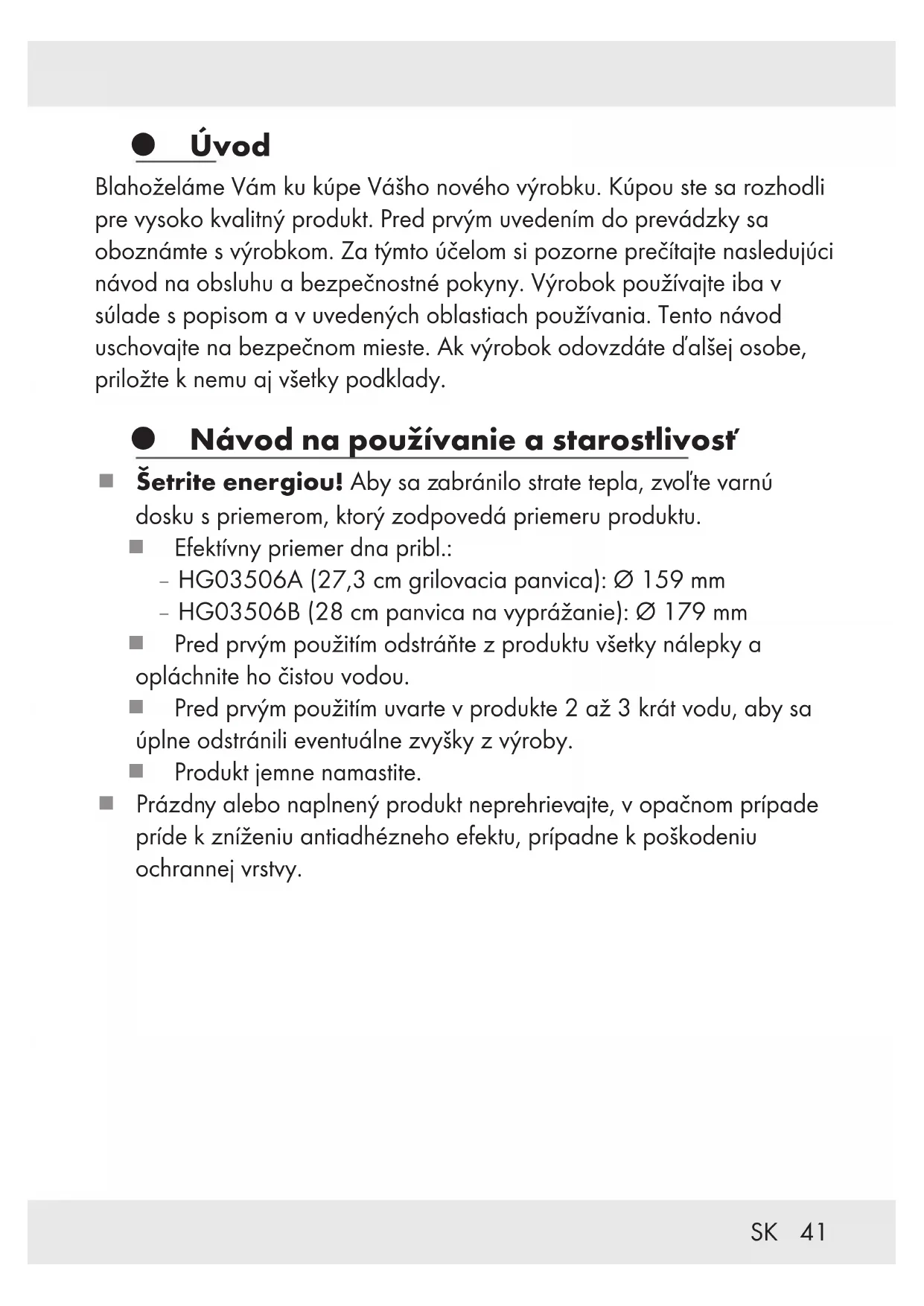 Úvod Blahoželáme Vám ku kúpe Vášho nového výrobku. Kúpou ste sa rozhodli pre vysoko kvalitný produkt. Pred prvým uvedením do prevádzky sa oboznámte s výrobkom. Za týmto účelom si pozorne prečítajte nasledujúci návod na obsluhu a bezpečnostné pokyny. Výrobok používajte iba v súlade s popisom a v uvedených oblastiach používania. Tento návod uschovajte na bezpečnom mieste. Ak výrobok odovzdáte ďalšej osobe, priložte k nemu aj všetky podklady. Návod na používanie a starostlivosť Šetrite energiou! Aby sa zabránilo strate tepla, zvoľte varnú dosku s priemerom, ktorý zodpovedá priemeru produktu. Efektívny priemer dna pribl.: – HG03506A (27,3 cm grilovacia panvica): Ø 159 mm – HG03506B (28 cm panvica na vyprážanie): Ø 179 mm Pred prvým použitím odstráňte z produktu všetky nálepky a opláchnite ho čistou vodou. Pred prvým použitím uvarte v produkte 2až3krát vodu, aby sa úplne odstránili eventuálne zvyšky z výroby. Produkt jemne namastite. Prázdny alebo naplnený produkt neprehrievajte, v opačnom prípade príde k zníženiu antiadhézneho efektu, prípadne k poškodeniu ochrannej vrstvy.42 SK Nebezpečenstvo prehriatia! Ak sa prehriaty kuchynský riad bez oleja dostane do kontaktu s potravinami bez tuku, môžu vzniknúť zafarbenia nepriľnavého povrchu spôsobené spálením bielkovín. Tieto sfarbené miesta sa považujú za stopy po používaní a v žiadnom prípade neovplyvňujú kvalitu vrchnej vrstvy a vhodnosť jej používania. Ohrejte jedlo na vysokom/miernom ohni a nechajte ho dôjsť na malom plameni. Pri zohrievaní tuku nenechávajte produkt bez dozoru: Prehriaty tuk sa môže vznietiť. Nikdy nehaste horiaci tuk vodou! Plameň uhaste pokrievkou alebo hrubou vlnenou prikrývkou. Používajte len kuchynské náradie z plastu alebo dreva, aby ste nepoškodili nepriľnavý povrch. Pripravované potraviny nekrájajte priamo v produkte. Do produktu nedávajte mokré kvapkajúce mäso. Tuk, ktorý by mohol odfrknúť na žeravú varnú platňu, by mohol spôsobiť požiar. Počas varenia sa môže rozohriať rukoväť. Na ochranu používajte chňapky alebo rukavice na grilovanie. Produkt je vhodný na plynové, elektrické, sklokeramické, indukčné a halogénové varné dosky.43SK Upozornenie pre indukčné dosky: Za určitých podmienok môže vznikať hluk, ktorý spôsobujú elektromagnetické vlastnosti ohrievacieho zdroja a produktu. Je to normálne a nepredstavuje to žiadnu poruchu vašej indukčnej varnej dosky alebo produktu. Produkt treba umiestniť na indukčnú varnú dosku presne do stredu. OPATRNE! Veľmi rýchle ohriatie! Produkt pri predhrievaní neprehrejte. V prípade prehriatia produktu musíte miestnosť dôkladne vyvetrať. Tento produkt spája výhody hliníkového riadu ako je nízka hmotnosť a vysoká tepelná vodivosť s výhodami varenia za pomoci indukcie. Aby to bolo možné, boli do hliníkového dna pridané magnetické oceľové prvky. Dno nie je preto celé magnetické, takže na indukčných varných doskách, ktoré sú o dosť väčšie ako je priemer dna, sa môže stať, že indukčné cievky nebudú reagovať. To nie je žiadna chyba kvality a nepredstavuje žiadne zníženie funkčnosti. Produkt bude fungovať správne, len ak ho vždy umiestnite na varnú dosku, ktorá zodpovedá efektívnemu priemeru dna uvedenému v tomto návode. Vysoké teploty môžu spôsobiť sfarbenie vonkajšej strany produktu. To nie je žiadna materiálová chyba a v žiadnom prípade neovplyvňuje kvalitu alebo funkciu produktu. Horúci produkt nikdy nechlaďte pod studenou tečúcou vodou. Tým by sa mohla spodná strana produktu poškodiť alebo z produktu odpadnúť.44 SK Produkt je vhodný na udržiavanie teploty jedál v rúre na pečenie (max.160°Cpočas1hodiny). Tento produkt je vhodný do umývačky riadu. Na ručné umývanie použite horúcu vodu a bežný prostriedok na umývanie riadu. Vyhnite sa používaniu ostrých a špicatých predmetov alebo kefiek, aby ste nepoškodili materiál. Pri čistení nepoužívajte žiadne abrazívne prostriedky. Časté čistenie ostrými čistiacimi prostriedkami môže spôsobiť poškodenie a/alebo sfarbenie produktu. Čistenie v umývačke riadu môže viesť k sfarbeniu hliníkových častí. OPATRNE! ŠKRABANCE! Zabráňte šúchaniu produktu po sklo-keramickej varnej doske! Pred tým, ako začnete s varením, odporúčame vám, aby ste utreli plochu varnej dosky a dno produktu čistou handrou, ktorá nepúšťa vlákna (napr. z mikrovlákna). Takto zabránite vzniku škrabancov. Vhodné pre potraviny: Tento produkt nemá žiadny vplyv na chuť a vôňu pripravovaných jedál. Produkt v žiadnom prípade nepoužívajte, ak je rukoväť uvoľnená. V takom prípade skrutku rukoväte utiahnite. Likvidácia Obal pozostáva z ekologických materiálov, ktoré môžete odovzdať na miestnych recyklačných zberných miestach. O možnostiach likvidácie opotrebovaného výrobku sa môžete informovať na Vašej obecnej alebo mestskej správe.45SK Záruka Tento výrobok bol dôkladne vyrobený podľa prísnych akostných smerníc a pred dodaním svedomito testovaný. V prípade nedostatkov tohto výrobku Vám prináležia zákonné práva voči predajcovi produktu. Tieto zákonné práva nie sú našou nižšie uvedenou zárukou obmedzené. Na tento produkt poskytujeme 3-ročnú záruku od dátumu nákupu. Záručná doba začína plynúť dátumom kúpy. Starostlivo si prosím uschovajte originálny pokladničný lístok. Tento doklad je potrebný ako dôkaz o kúpe. Ak sa v rámci 3 rokov od dátumu nákupu tohto výrobku vyskytne chyba materiálu alebo výrobná chyba, výrobok Vám bezplatne opravíme alebo vymeníme – podľa nášho výberu. Táto záruka zaniká, ak bol produkt poškodený, neodborne používaný alebo neodborne udržiavaný. Poskytnutie záruky sa vzťahuje na chyby materiálu a výrobné chyby. Táto záruka sa nev
