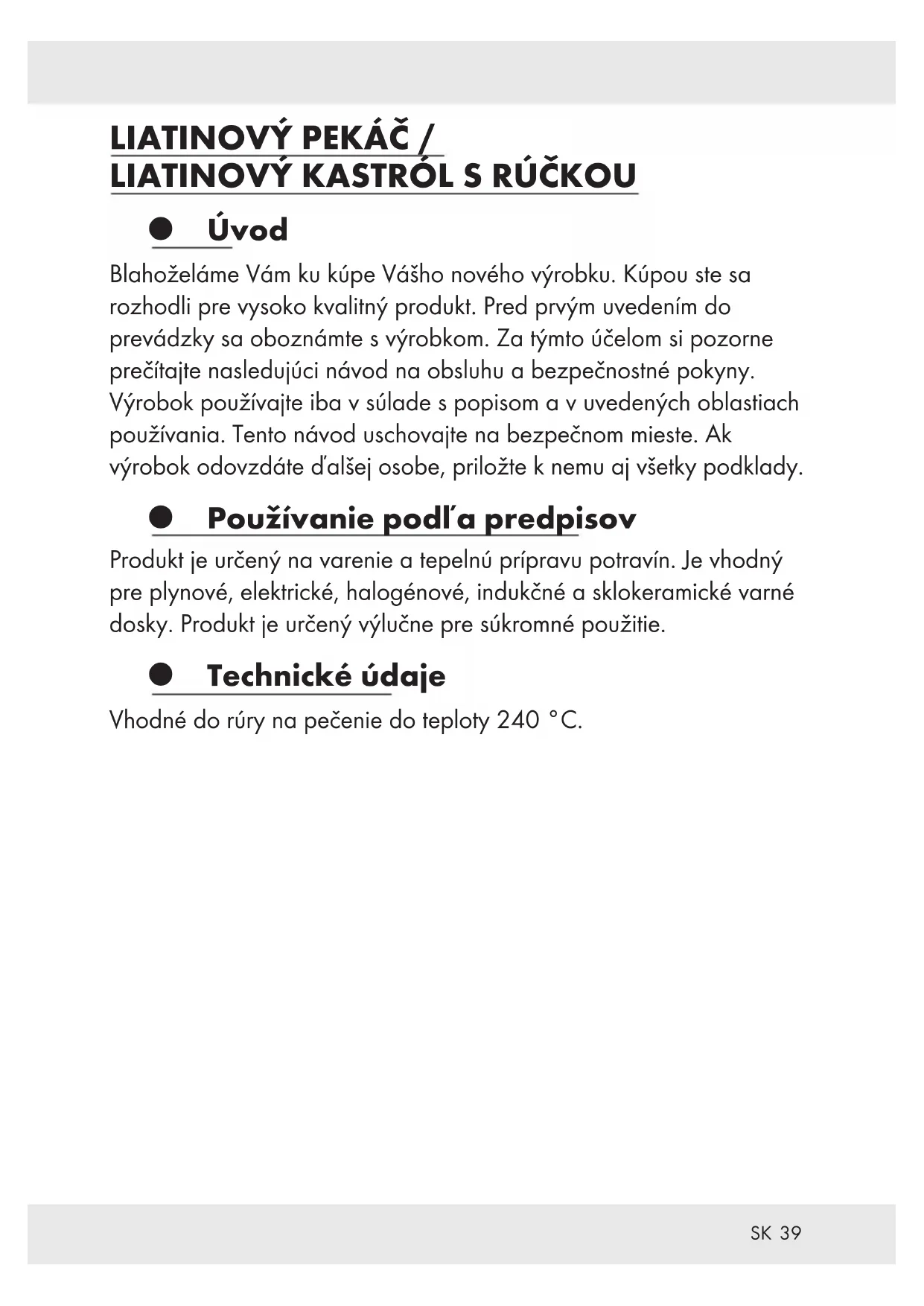 Úvod Blahoželáme Vám ku kúpe Vášho nového výrobku. Kúpou ste sa rozhodli pre vysoko kvalitný produkt. Pred prvým uvedením do prevádzky sa oboznámte s výrobkom. Za týmto účelom si pozorne prečítajte nasledujúci návod na obsluhu a bezpečnostné pokyny. Výrobok používajte iba v súlade s popisom a v uvedených oblastiach používania. Tento návod uschovajte na bezpečnom mieste. Ak výrobok odovzdáte ďalšej osobe, priložte k nemu aj všetky podklady. Používanie podľa predpisov Produkt je určený na varenie a tepelnú prípravu potravín. Je vhodný pre plynové, elektrické, halogénové, indukčné a sklokeramické varné dosky. Produkt je určený výlučne pre súkromné použitie. Technické údaje Vhodné do rúry na pečenie do teploty 240 °C.40