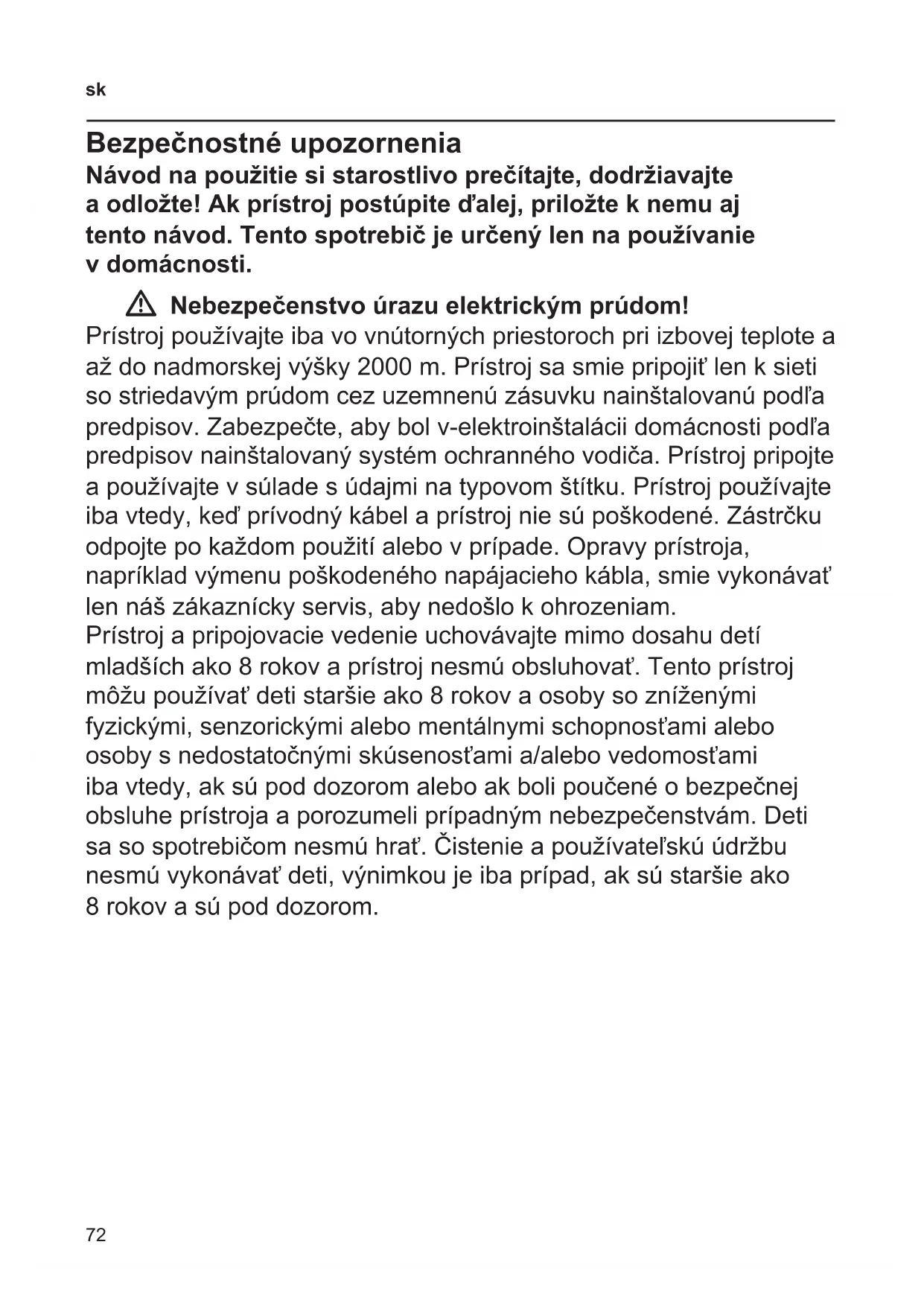 Bezpečnostné upozornenia Návod na použitie si starostlivo prečítajte, dodržiavajte a odložte! Ak prístroj postúpite ďalej, priložte k nemu aj tento návod. Tento spotrebič je určený len na používanie v domácnosti. W Nebezpečenstvo úrazu elektrickým prúdom! Prístroj používajte iba vo vnútorných priestoroch pri izbovej teplote a až do nadmorskej výšky 2000 m. Prístroj sa smie pripojiť len k sieti so striedavým prúdom cez uzemnenú zásuvku nainštalovanú podľa predpisov. Zabezpečte, aby bol v-elektroinštalácii domácnosti podľa predpisov nainštalovaný systém ochranného vodiča. Prístroj pripojte a používajte v súlade s údajmi na typovom štítku. Prístroj používajte iba vtedy, keď prívodný kábel a prístroj nie sú poškodené. Zástrčku odpojte po každom použití alebo v prípade. Opravy prístroja, napríklad výmenu poškodeného napájacieho kábla, smie vykonávať len náš zákaznícky servis, aby nedošlo k ohrozeniam. Prístroj a pripojovacie vedenie uchovávajte mimo dosahu detí mladších ako 8 rokov a prístroj nesmú obsluhovať. Tento prístroj môžu používať deti staršie ako 8 rokov a osoby so zníženými fyzickými, senzorickými alebo mentálnymi schopnosťami alebo osoby s nedostatočnými skúsenosťami a/alebo vedomosťami iba vtedy, ak sú pod dozorom alebo ak boli poučené o bezpečnej obsluhe prístroja a porozumeli prípadným nebezpečenstvám. Deti sa so spotrebičom nesmú hrať. Čistenie a používateľskú údržbu nesmú vykonávať deti, výnimkou je iba prípad, ak sú staršie ako 8 rokov a sú pod dozorom.73